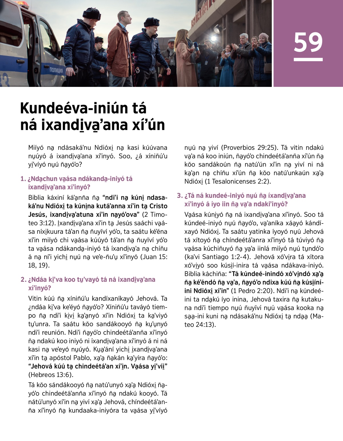 Kaʼvindó Hechos 5:27-29 xíʼin Hebreos 10:24, 25. Tándi̱ʼi ka̱ʼvindó iin tá iin texto yóʼo ka̱ʼa̱nndó xa̱ʼa̱ ña̱yóʼo:
