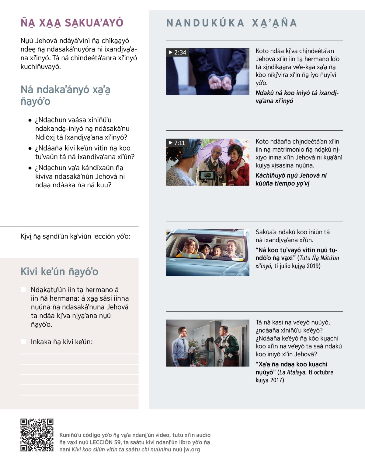 Xíniñúʼu ndakú koo iniyó tá inkana sásina nu̱úyó ña̱ ndasakáʼnuyó Jehová. Kotondó VIDEO ta ka̱ʼa̱nndó xa̱ʼa̱ ña̱yóʼo: