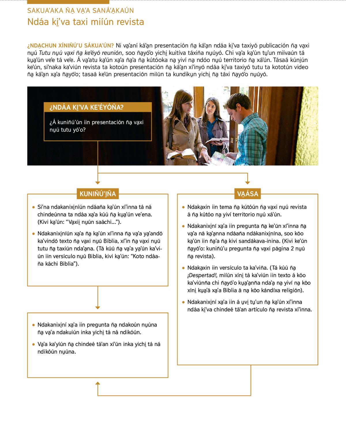 ¿NDA̱CHUN XÍNIÑÚʼU SÁKUAʼÚN? Ni va̱ʼaní káʼa̱n presentación ña̱ káʼa̱n ndáa ki̱ʼva taxiyó publicación ña̱ va̱xi nu̱ú Tutu nu̱ú va̱xi ña̱ keʼéyó reunión, soo ña̱yóʼo yichi̱ kuitíva táxiña nu̱úyó. Chi va̱ʼa ka̱ʼún tu̱ʼun miívaún tá ku̱a̱ʼún veʼe tá veʼe. Á va̱ʼatu ka̱ʼún xa̱ʼa ña̱ʼa ña̱ kútóoka na̱ yiví na̱ ndóo nu̱ú territorio ña̱ xáʼún. Tásaá kúni̱ún keʼún, siʼnaka kaʼviún revista ta kotoún presentación ña̱ káʼa̱n xíʼinyó ndáa ki̱ʼva taxiyó tutu ta kototún video ña̱ káʼa̱n xa̱ʼa ña̱yóʼo; tasaá keʼún presentación miíún ta kundiku̱n yichi̱ ña̱ táxi ña̱yóʼo nu̱úyó.
