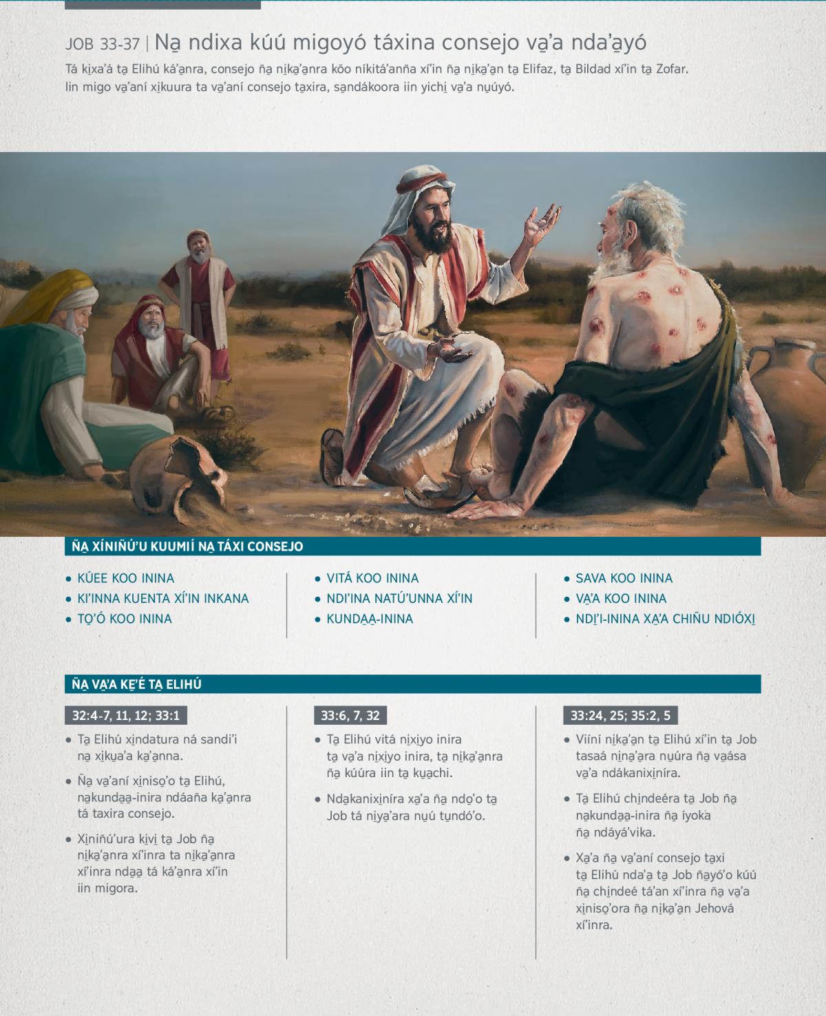Tá ki̱xaʼá ta̱ Elihú káʼa̱nra, consejo ña̱ ni̱ka̱ʼa̱nra kǒo níkitáʼanña xíʼin ña̱ ni̱ka̱ʼa̱n ta̱ Elifaz, ta̱ Bildad xíʼin ta̱ Zofar. Iin migo va̱ʼaní xi̱kuura ta va̱ʼaní consejo ta̱xira, sa̱ndákoora iin yichi̱ va̱ʼa nu̱úyó.