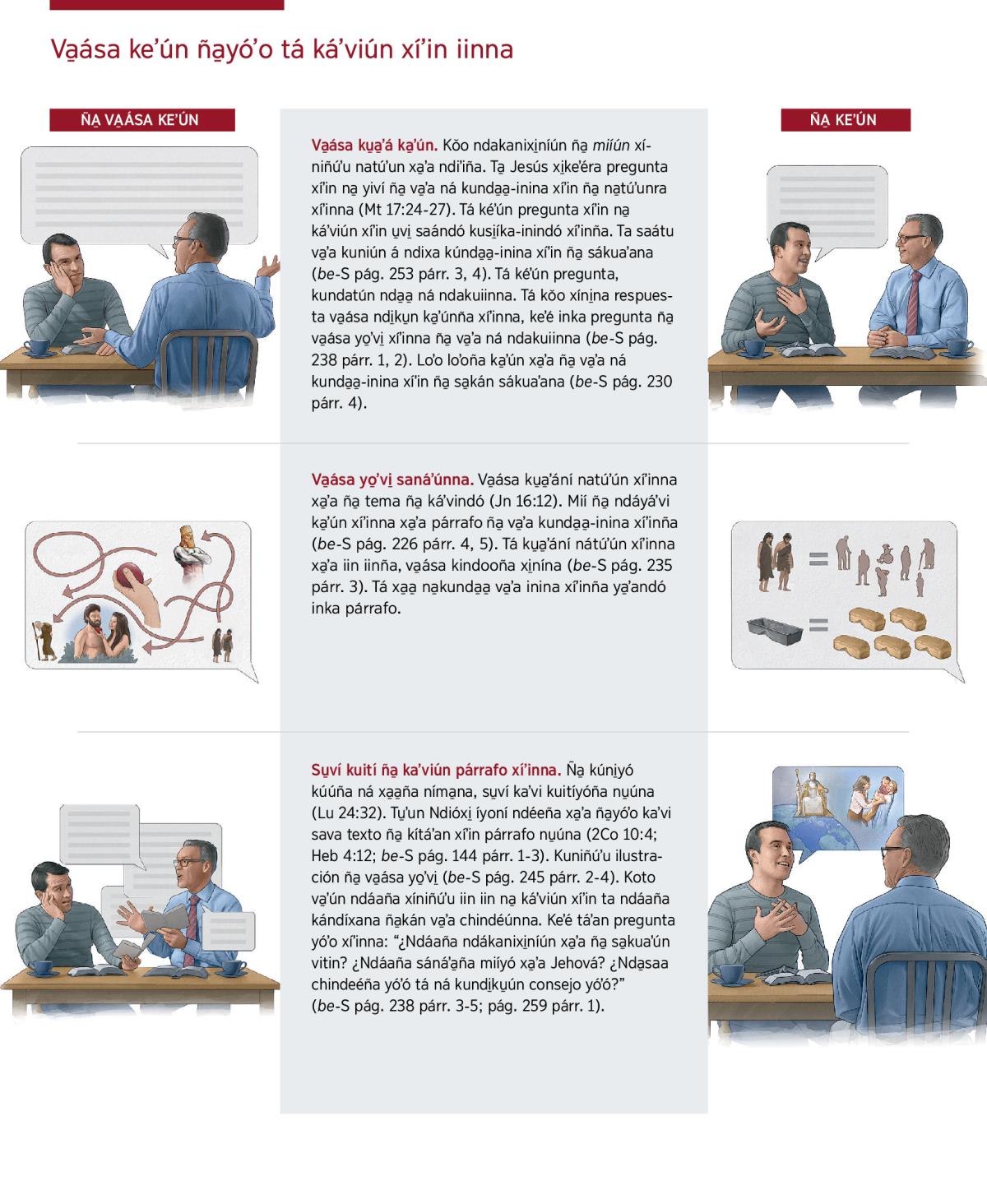 Su̱ví kuití ña̱ kaʼviún párrafo xíʼinna. Ña̱ kúni̱yó kúúña ná xa̱a̱ña níma̱na, su̱ví kaʼvi kuitíyóña nu̱úna (Lu 24:32). Tu̱ʼun Ndióxi̱ íyoní ndéeña xa̱ʼa ña̱yóʼo kaʼvi sava texto ña̱ kítáʼan xíʼin párrafo nu̱úna (2Co 10:4; Heb 4:12; be-S pág. 144 párr. 1-3). Kuniñúʼu ilustración ña̱ va̱ása yo̱ʼvi̱ (be-S pág. 245 párr. 2-4). Koto va̱ʼún ndáaña xíniñúʼu iin iin na̱ káʼviún xíʼin ta ndáaña kándíxana ña̱kán va̱ʼa chindéúnna. Keʼé táʼan pregunta yóʼo xíʼinna: “¿Ndáaña ndákanixi̱níún xa̱ʼa ña̱ sa̱kuaʼún vitin? ¿Ndáaña sánáʼa̱ña miíyó xa̱ʼa Jehová? ¿Nda̱saa chindeéña yóʼó tá ná kundi̱ku̱ún consejo yóʼó?” (be-S pág. 238 párr. 3-5; pág. 259 párr. 1).