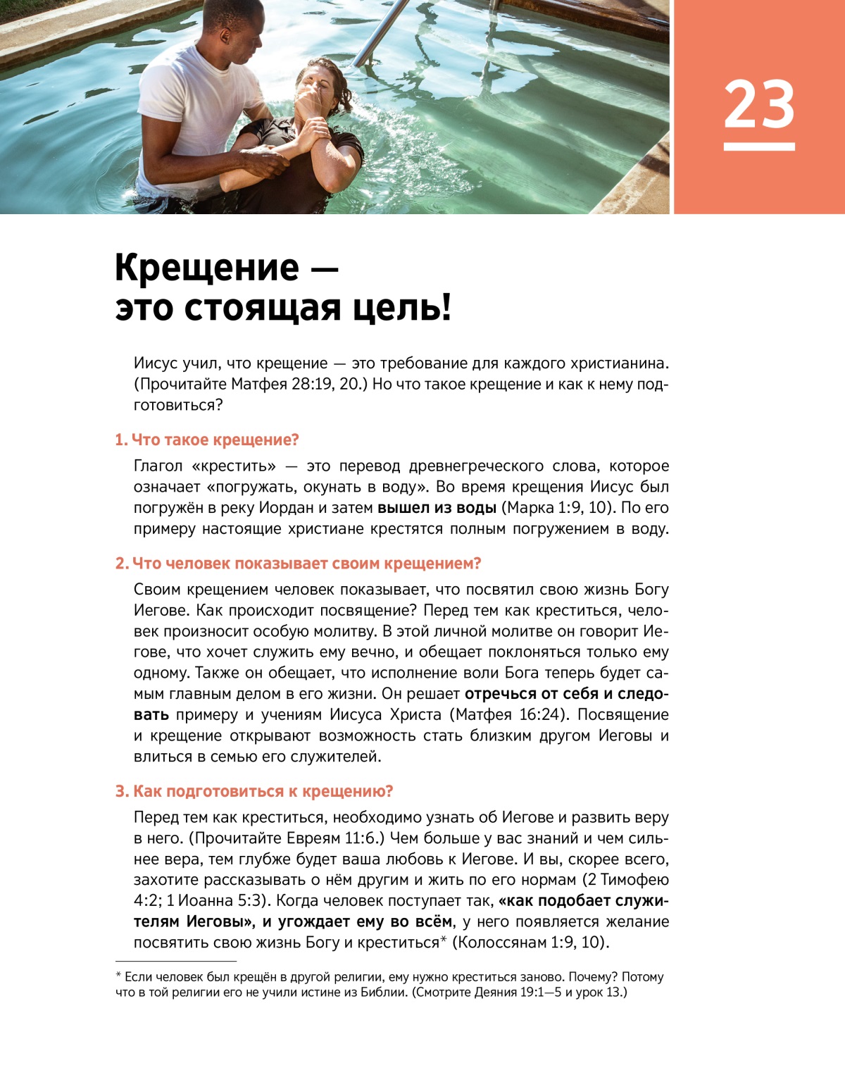 a Если человек был крещён в другой религии, ему нужно креститься заново. Почему? Потому что в той религии его не учили истине из Библии. (Смотрите Деяния 19:1—5 и урок 13.)