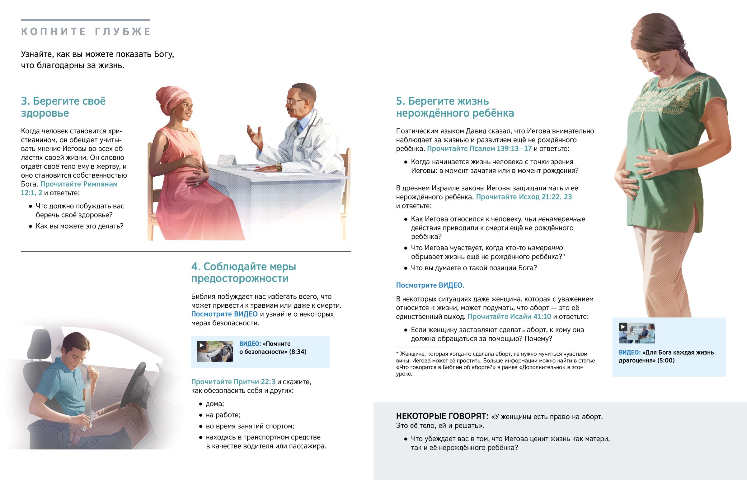 Иегова полюбил вас с того самого момента, как началась ваша жизнь в утробе матери. Один из служителей Бога, Давид, сказал ему: «Ты видел меня, когда я ещё был зародышем» (Псалом 139:16). Иегова высоко ценит вашу жизнь. (Прочитайте Матфея 10:29—31.) Ему очень больно, когда кто-то намеренно отнимает жизнь другого человека или даже лишает жизни себя (Исход 20:13)a. Также Иегове больно, если человек подвергает свою жизнь или жизнь других людей ненужному риску. Если же мы бережно относимся к своей жизни и жизни других, мы тем самым показываем, что ценим этот уникальный подарок от Иеговы.