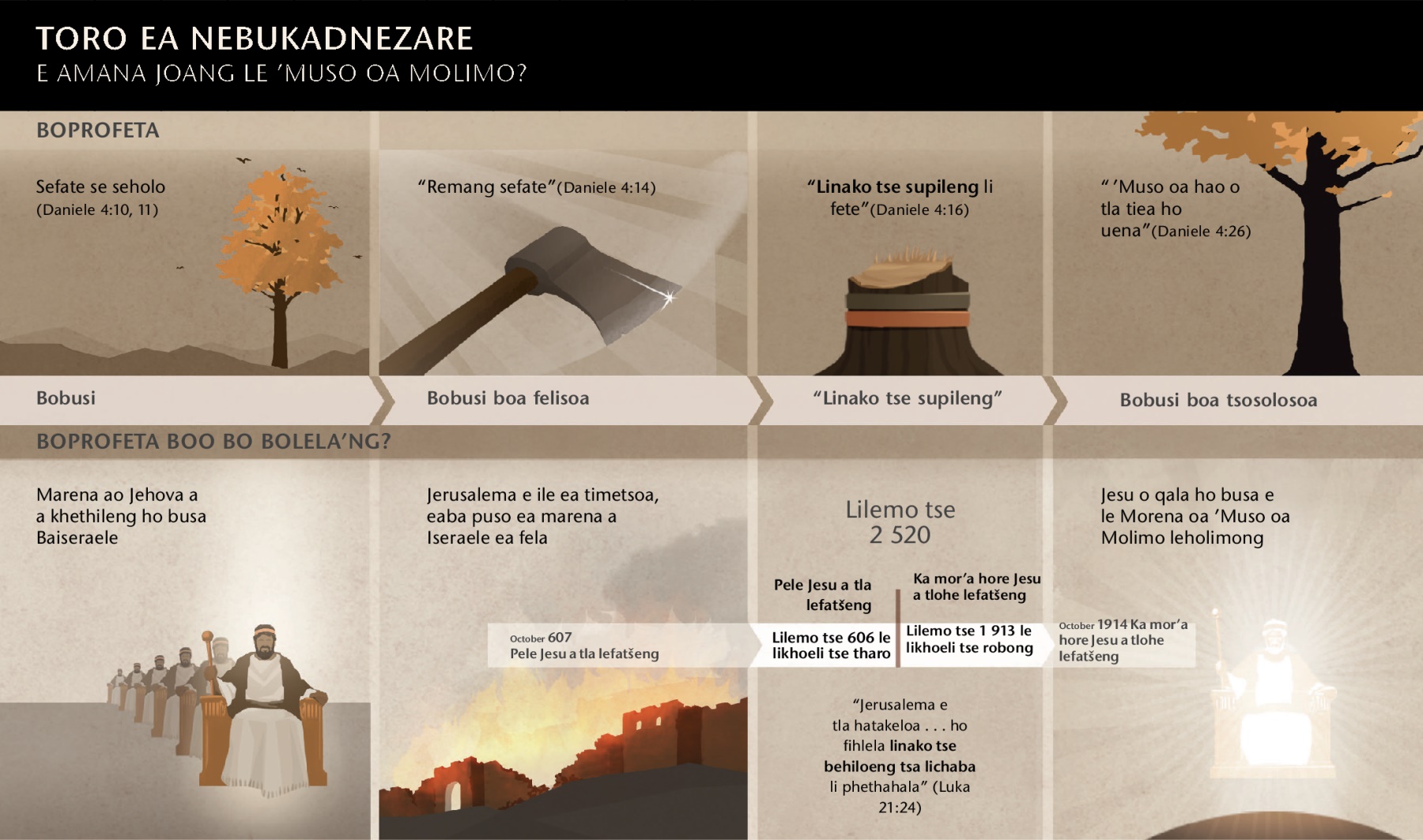 Boprofeta: Jehova o ile a etsa hore Morena Nebukadnezare a lore ka sefate se seholo se ileng sa rengoa. Eaba kutu ea sefate seo e tlangoa ka lebanta le entsoeng ka tšepe le koporo e le hore ho fete “linako tse supileng” se sa hole. Ka mor’a moo, sefate seo se ne se tla boela se hole.—Daniele 4:1, 10-16.