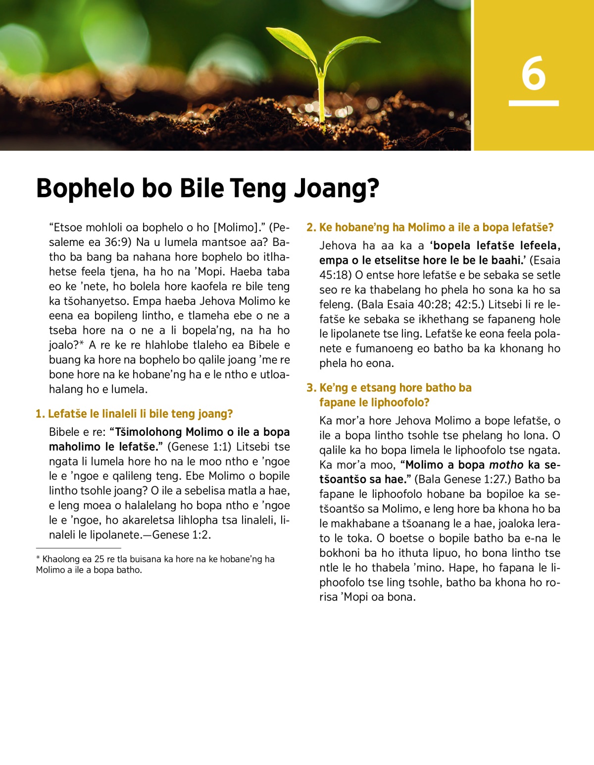 “Etsoe mohloli oa bophelo o ho [Molimo].” (Pesaleme ea 36:9) Na u lumela mantsoe aa? Batho ba bang ba nahana hore bophelo bo itlhahetse feela tjena, ha ho na ’Mopi. Haeba taba eo ke ’nete, ho bolela hore kaofela re bile teng ka tšohanyetso. Empa haeba Jehova Molimo ke eena ea bopileng lintho, e tlameha ebe o ne a tseba hore na o ne a li bopela’ng, na ha ho joalo?a A re ke re hlahlobe tlaleho ea Bibele e buang ka hore na bophelo bo qalile joang ’me re bone hore na ke hobane’ng ha e le ntho e utloahalang ho e lumela.