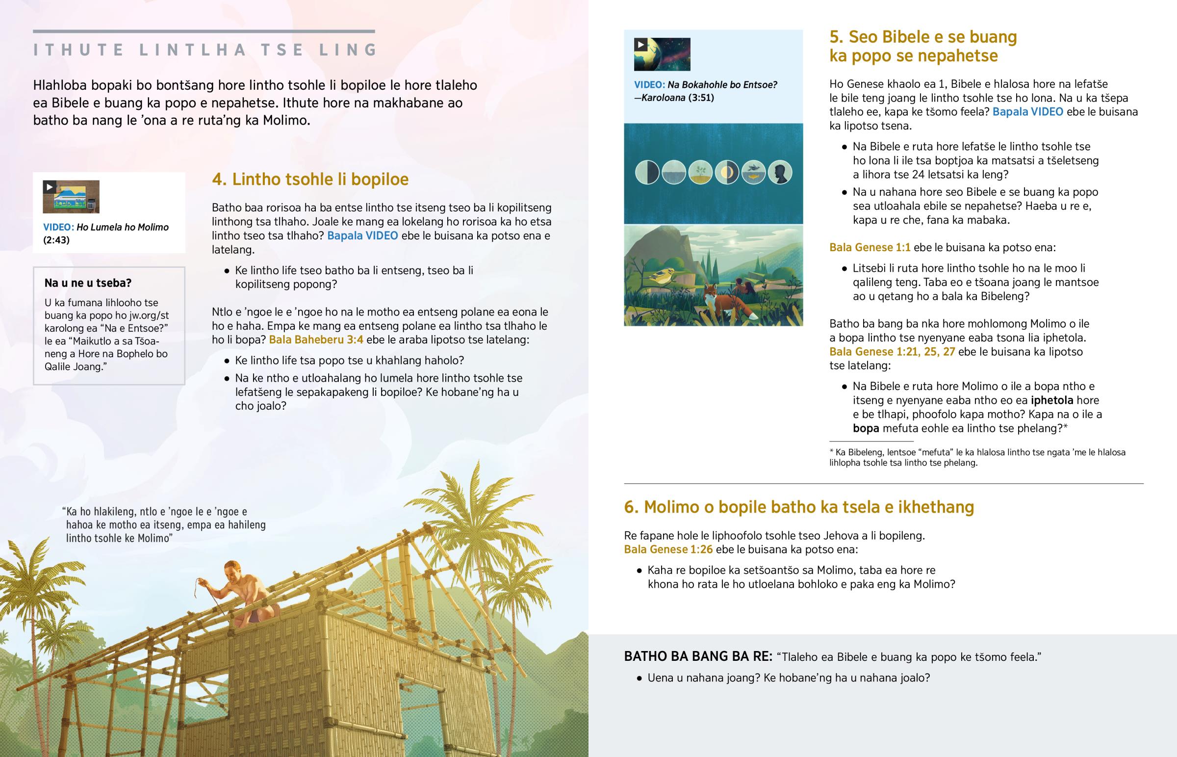 Ka mor’a hore Jehova Molimo a bope lefatše, o ile a bopa lintho tsohle tse phelang ho lona. O qalile ka ho bopa limela le liphoofolo tse ngata. Ka mor’a moo, “Molimo a bopa motho ka setšoantšo sa hae.” (Bala Genese 1:27.) Batho ba fapane le liphoofolo hobane ba bopiloe ka setšoantšo sa Molimo, e leng hore ba khona ho ba le makhabane a tšoanang le a hae, joaloka lerato le toka. O boetse o bopile batho ba e-na le bokhoni ba ho ithuta lipuo, ho bona lintho tse ntle le ho thabela ’mino. Hape, ho fapana le liphoofolo tse ling tsohle, batho ba khona ho rorisa ’Mopi oa bona.