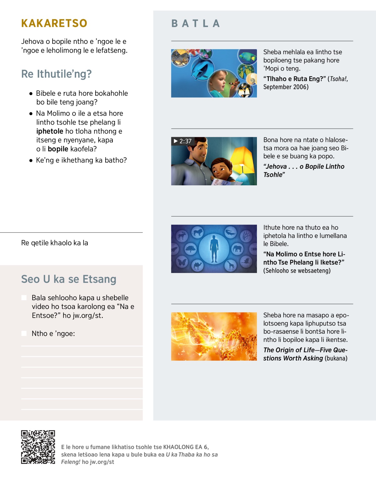 “Na Molimo o Entse hore Lintho Tse Phelang li Iketse?” (Sehlooho se websaeteng)