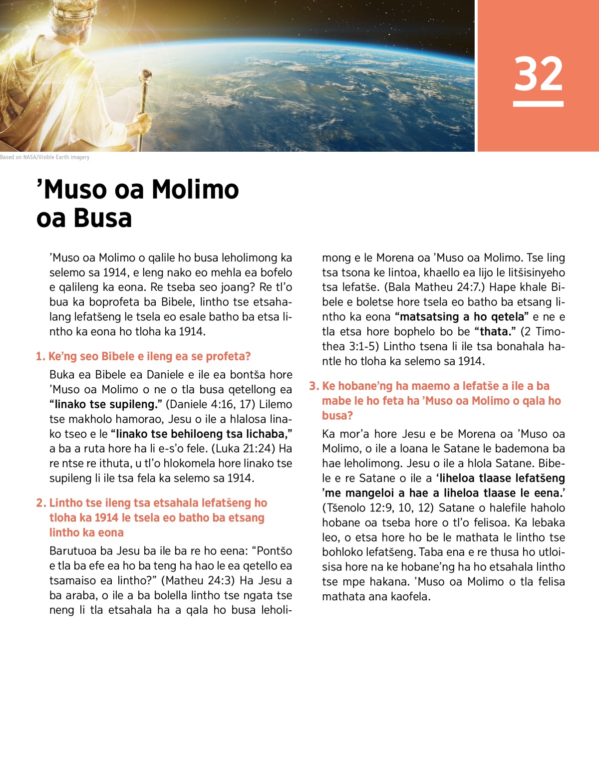 ’Muso oa Molimo o qalile ho busa leholimong ka selemo sa 1914, e leng nako eo mehla ea bofelo e qalileng ka eona. Re tseba seo joang? Re tl’o bua ka boprofeta ba Bibele, lintho tse etsahalang lefatšeng le tsela eo esale batho ba etsa lintho ka eona ho tloha ka 1914.