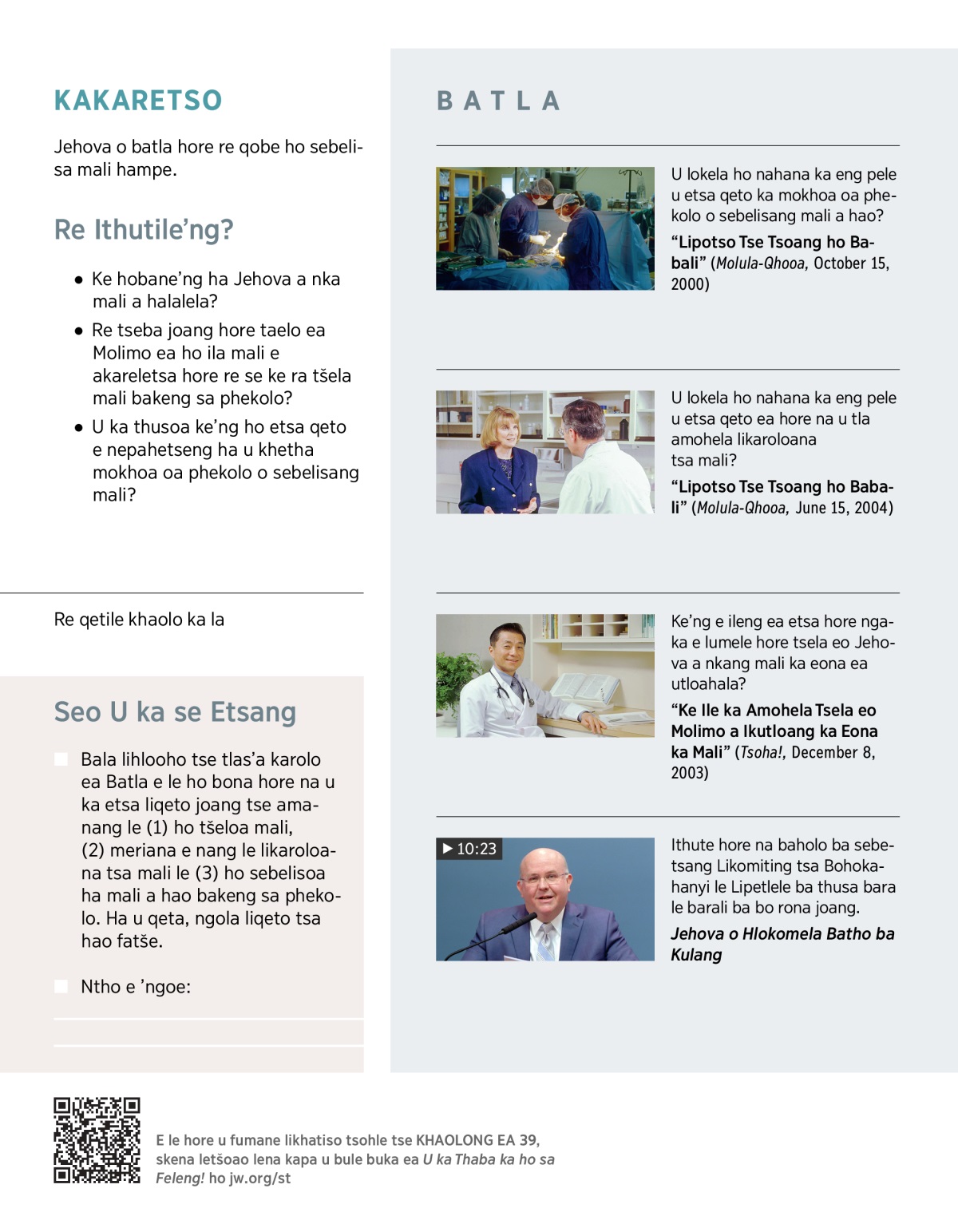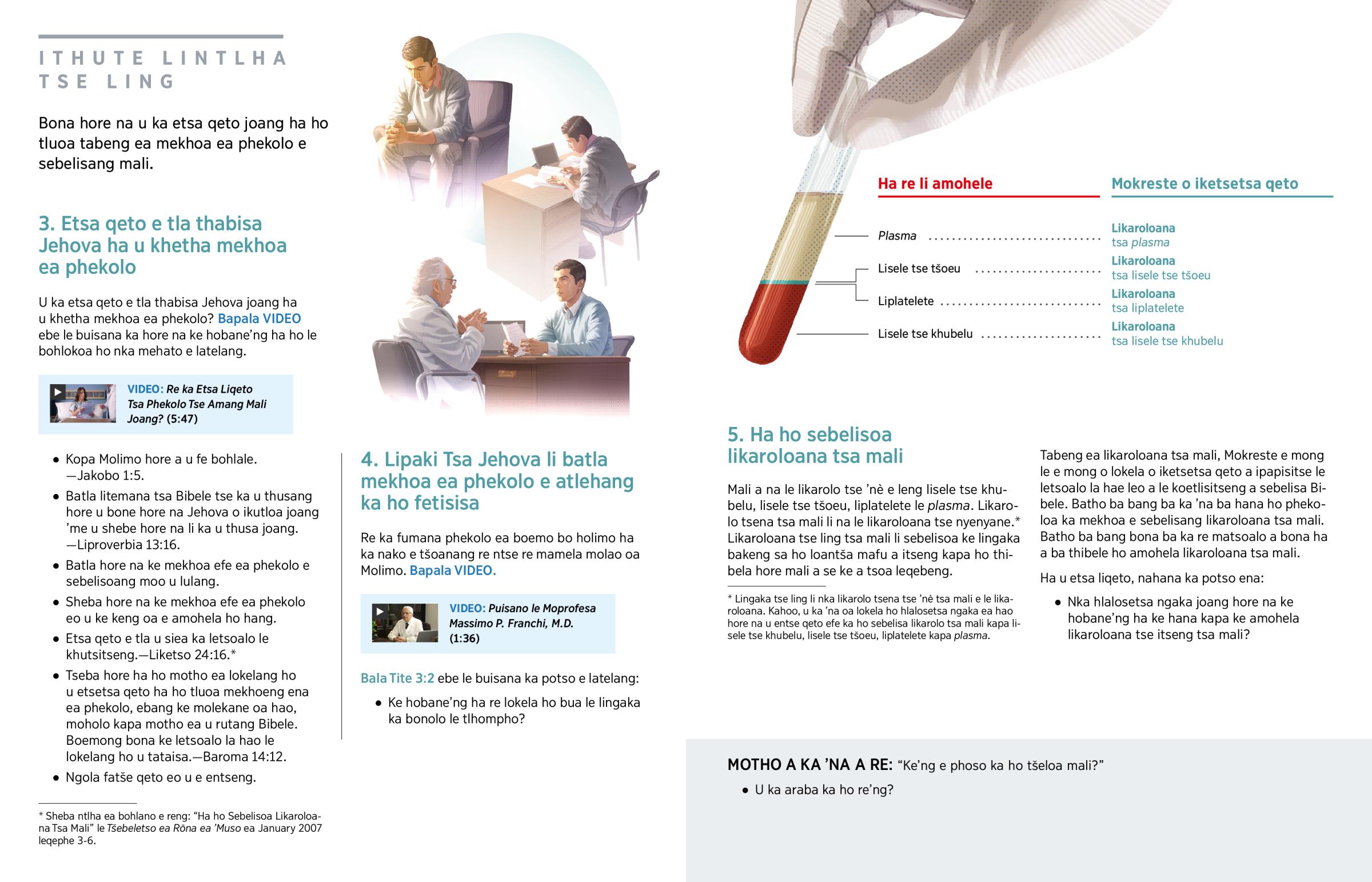 U ka etsa qeto e tla thabisa Jehova joang ha u khetha mekhoa ea phekolo? Bapala VIDEO ebe le buisana ka hore na ke hobane’ng ha ho le bohlokoa ho nka mehato e latelang.