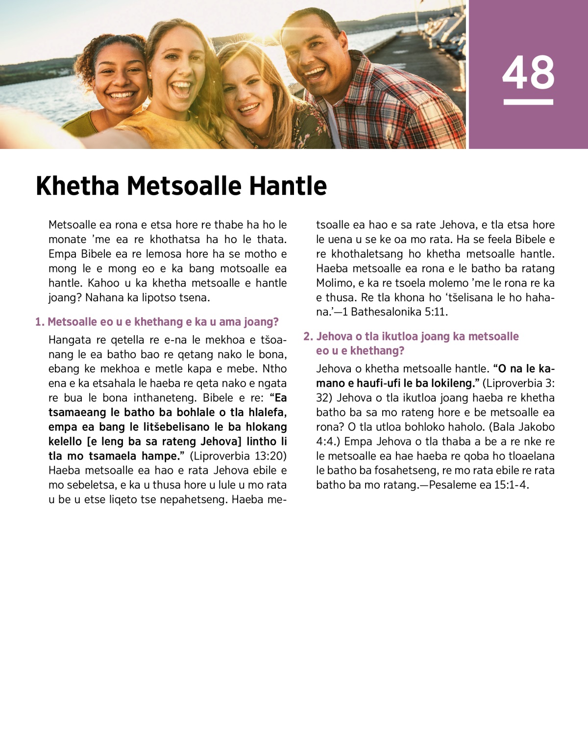 Metsoalle ea rona e etsa hore re thabe ha ho le monate ’me ea re khothatsa ha ho le thata. Empa Bibele ea re lemosa hore ha se motho e mong le e mong eo e ka bang motsoalle ea hantle. Kahoo u ka khetha metsoalle e hantle joang? Nahana ka lipotso tsena.