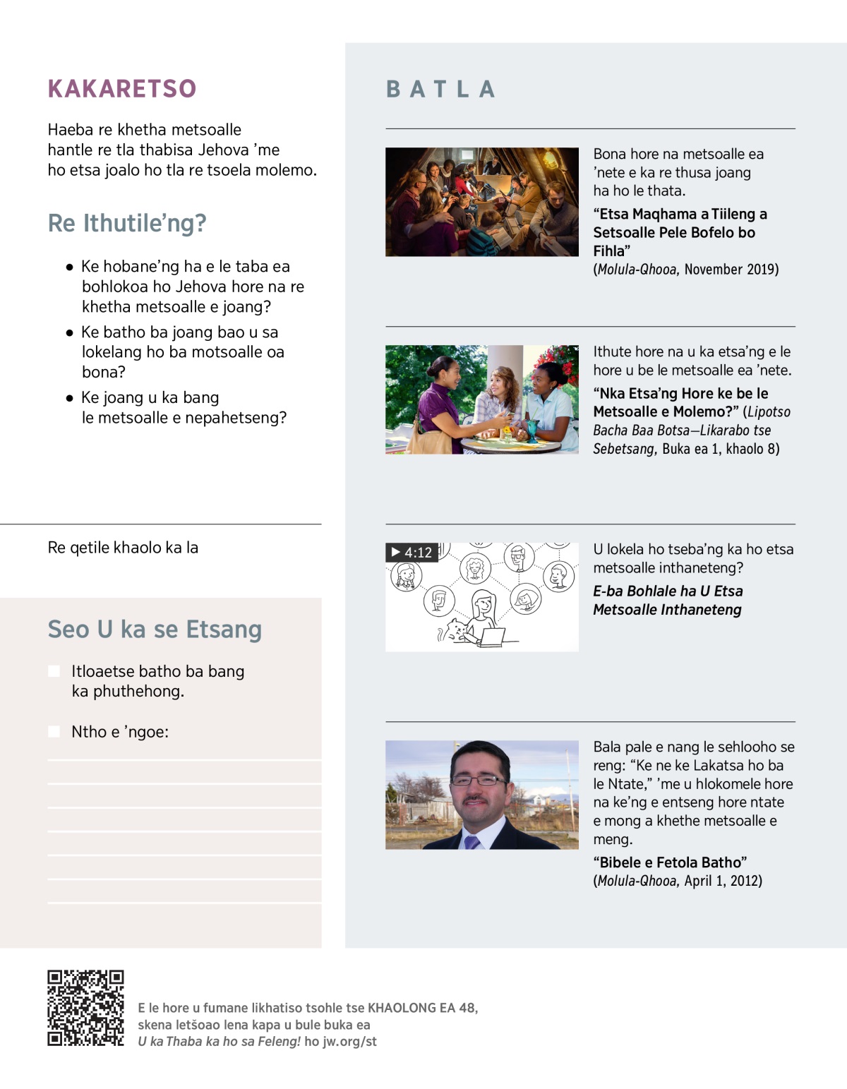 Hangata re qetella re e-na le mekhoa e tšoanang le ea batho bao re qetang nako le bona, ebang ke mekhoa e metle kapa e mebe. Ntho ena e ka etsahala le haeba re qeta nako e ngata re bua le bona inthaneteng. Bibele e re: “Ea tsamaeang le batho ba bohlale o tla hlalefa, empa ea bang le litšebelisano le ba hlokang kelello [e leng ba sa rateng Jehova] lintho li tla mo tsamaela hampe.” (Liproverbia 13:20) Haeba metsoalle ea hao e rata Jehova ebile e mo sebeletsa, e ka u thusa hore u lule u mo rata u be u etse liqeto tse nepahetseng. Haeba metsoalle ea hao e sa rate Jehova, e tla etsa hore le uena u se ke oa mo rata. Ha se feela Bibele e re khothaletsang ho khetha metsoalle hantle. Haeba metsoalle ea rona e le batho ba ratang Molimo, e ka re tsoela molemo ’me le rona re ka e thusa. Re tla khona ho ‘tšelisana le ho hahana.’—1 Bathesalonika 5:11.