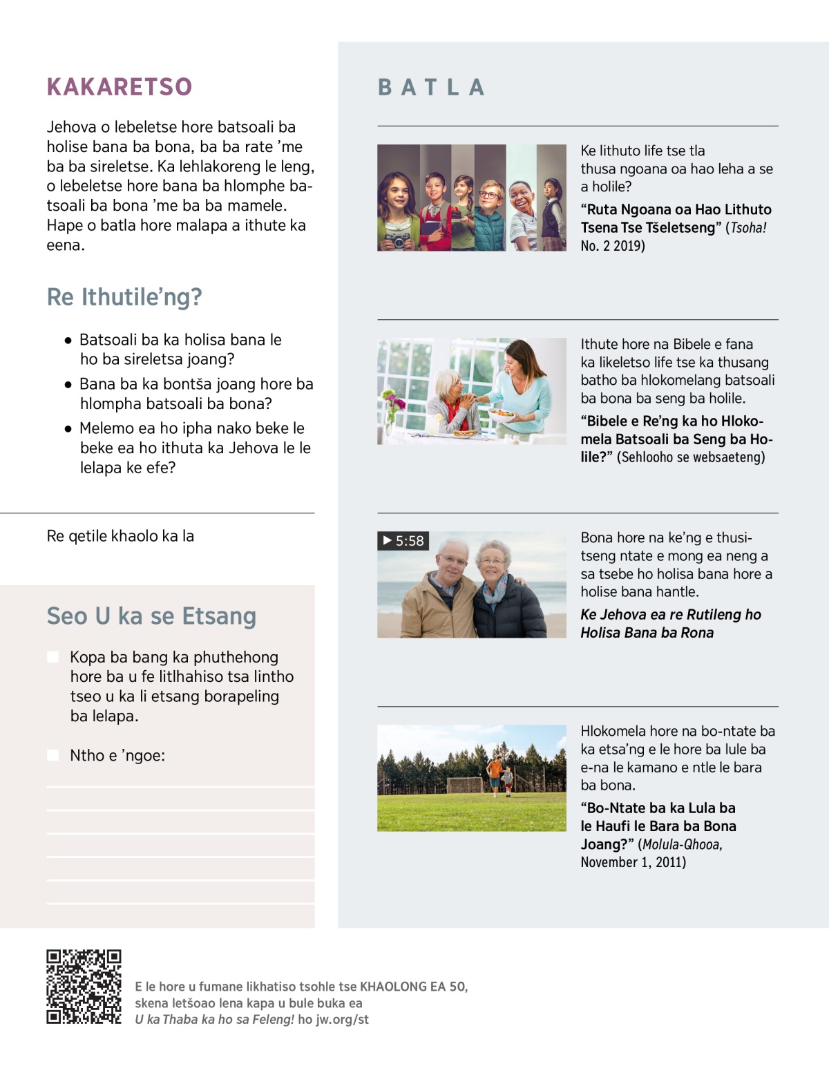 Haeba u na le bana ba banyenyane, daonlouda kapa u printe e ’ngoe ea lingoloa tse bontšang lintho tseo bana ba ka li etsang tse hlahang ho jw.org.