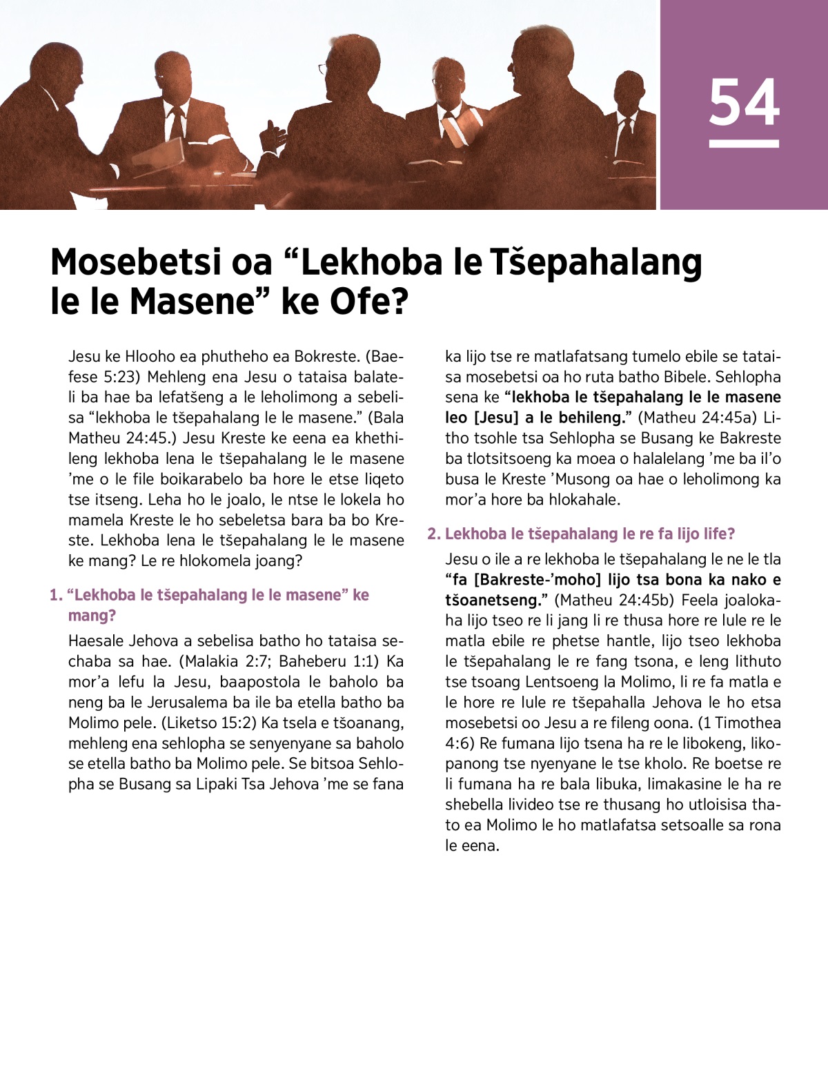 Jesu ke Hlooho ea phutheho ea Bokreste. (Baefese 5:23) Mehleng ena Jesu o tataisa balateli ba hae ba lefatšeng a le leholimong a sebelisa “lekhoba le tšepahalang le le masene.” (Bala Matheu 24:45.) Jesu Kreste ke eena ea khethileng lekhoba lena le tšepahalang le le masene ’me o le file boikarabelo ba hore le etse liqeto tse itseng. Leha ho le joalo, le ntse le lokela ho mamela Kreste le ho sebeletsa bara ba bo Kreste. Lekhoba lena le tšepahalang le le masene ke mang? Le re hlokomela joang?