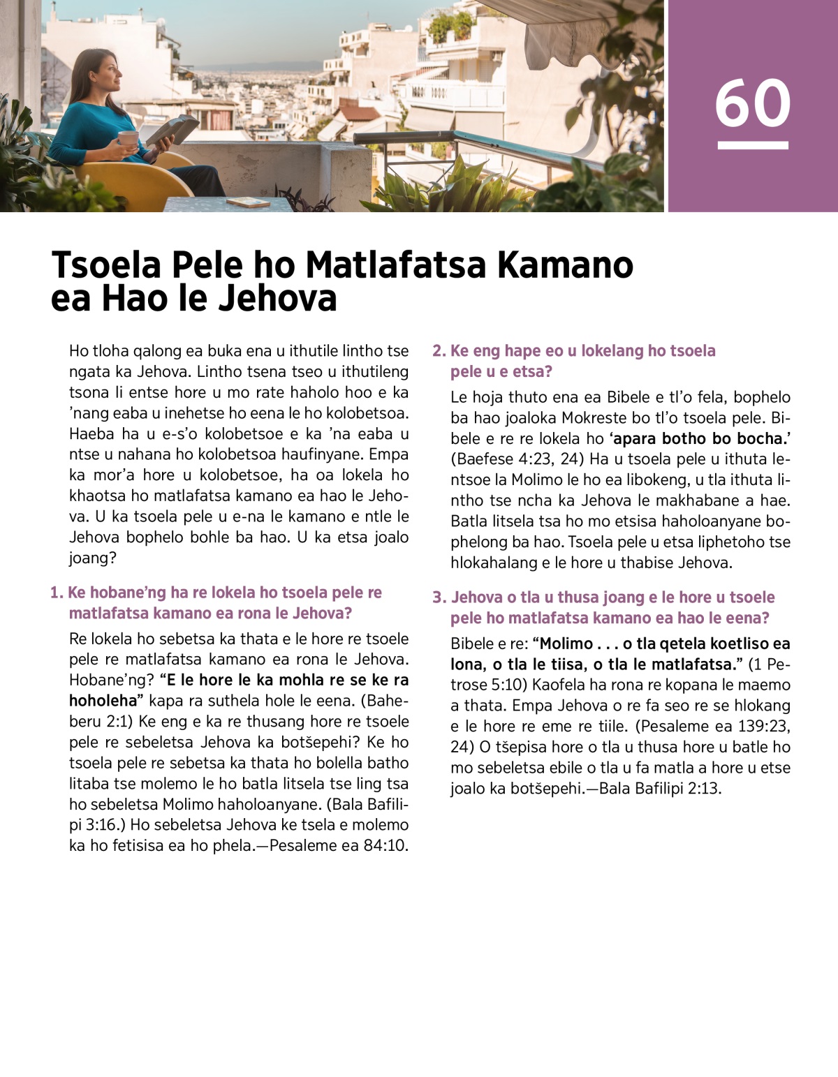 Bibele e re: “Molimo . . . o tla qetela koetliso ea lona, o tla le tiisa, o tla le matlafatsa.” (1 Petrose 5:10) Kaofela ha rona re kopana le maemo a thata. Empa Jehova o re fa seo re se hlokang e le hore re eme re tiile. (Pesaleme ea 139:23, 24) O tšepisa hore o tla u thusa hore u batle ho mo sebeletsa ebile o tla u fa matla a hore u etse joalo ka botšepehi.—Bala Bafilipi 2:13.
