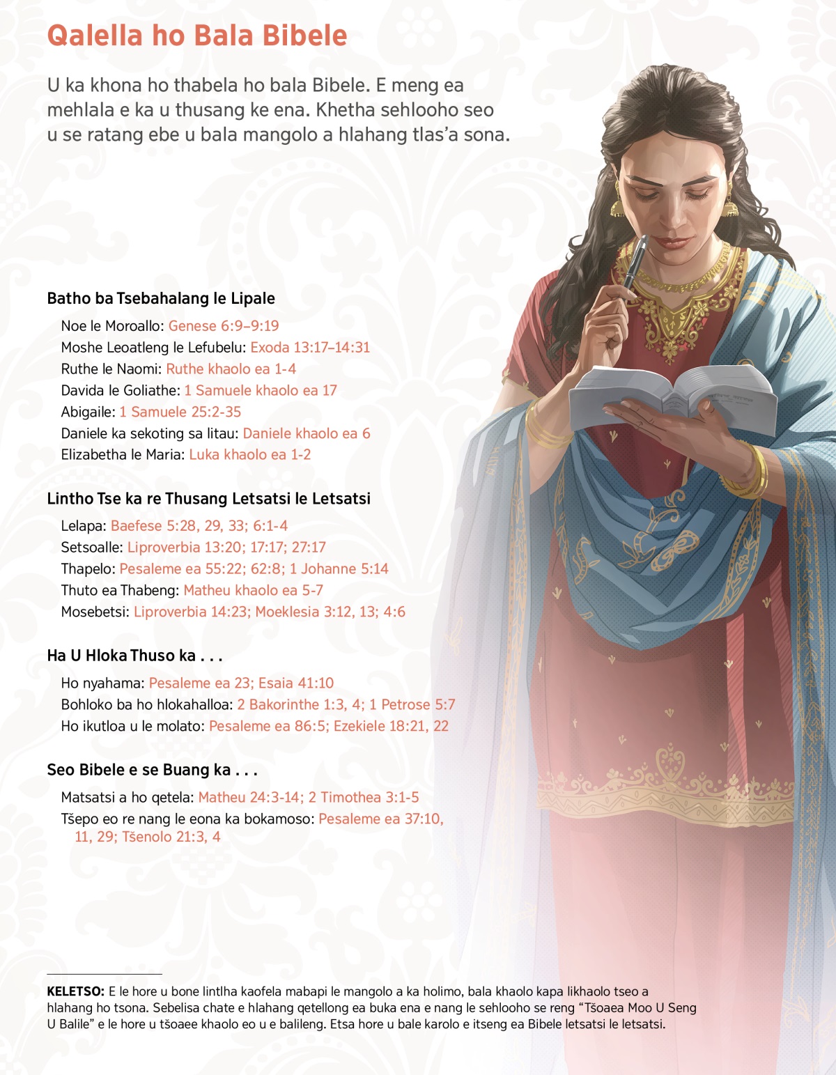 KELETSO: E le hore u bone lintlha kaofela mabapi le mangolo a ka holimo, bala khaolo kapa likhaolo tseo a hlahang ho tsona. Sebelisa chate e hlahang qetellong ea buka ena e nang le sehlooho se reng “Tšoaea Moo U Seng U Balile” e le hore u tšoaee khaolo eo u e balileng. Etsa hore u bale karolo e itseng ea Bibele letsatsi le letsatsi.