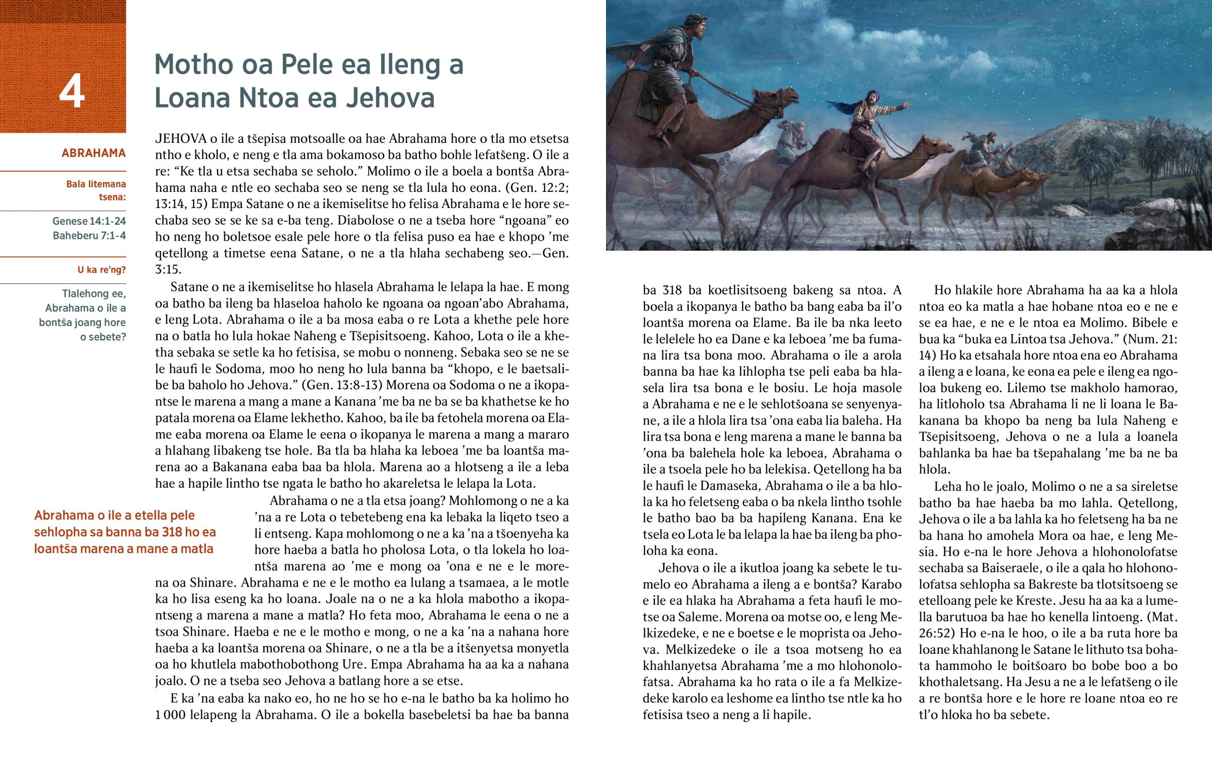 Satane o ne a ikemiselitse ho hlasela Abrahama le lelapa la hae. E mong oa batho ba ileng ba hlaseloa haholo ke ngoana oa ngoan’abo Abrahama, e leng Lota. Abrahama o ile a ba mosa eaba o re Lota a khethe pele hore na o batla ho lula hokae Naheng e Tšepisitsoeng. Kahoo, Lota o ile a khetha sebaka se setle ka ho fetisisa, se mobu o nonneng. Sebaka seo se ne se le haufi le Sodoma, moo ho neng ho lula banna ba “khopo, e le baetsalibe ba baholo ho Jehova.” (Gen. 13:8-13) Morena oa Sodoma o ne a ikopantse le marena a mang a mane a Kanana ’me ba ne ba se ba khathetse ke ho patala morena oa Elame lekhetho. Kahoo, ba ile ba fetohela morena oa Elame eaba morena oa Elame le eena o ikopanya le marena a mang a mararo a hlahang libakeng tse hole. Ba tla ba hlaha ka leboea ’me ba loantša marena ao a Bakanana eaba baa ba hlola. Marena ao a hlotseng a ile a leba hae a hapile lintho tse ngata le batho ho akareletsa le lelapa la Lota.
