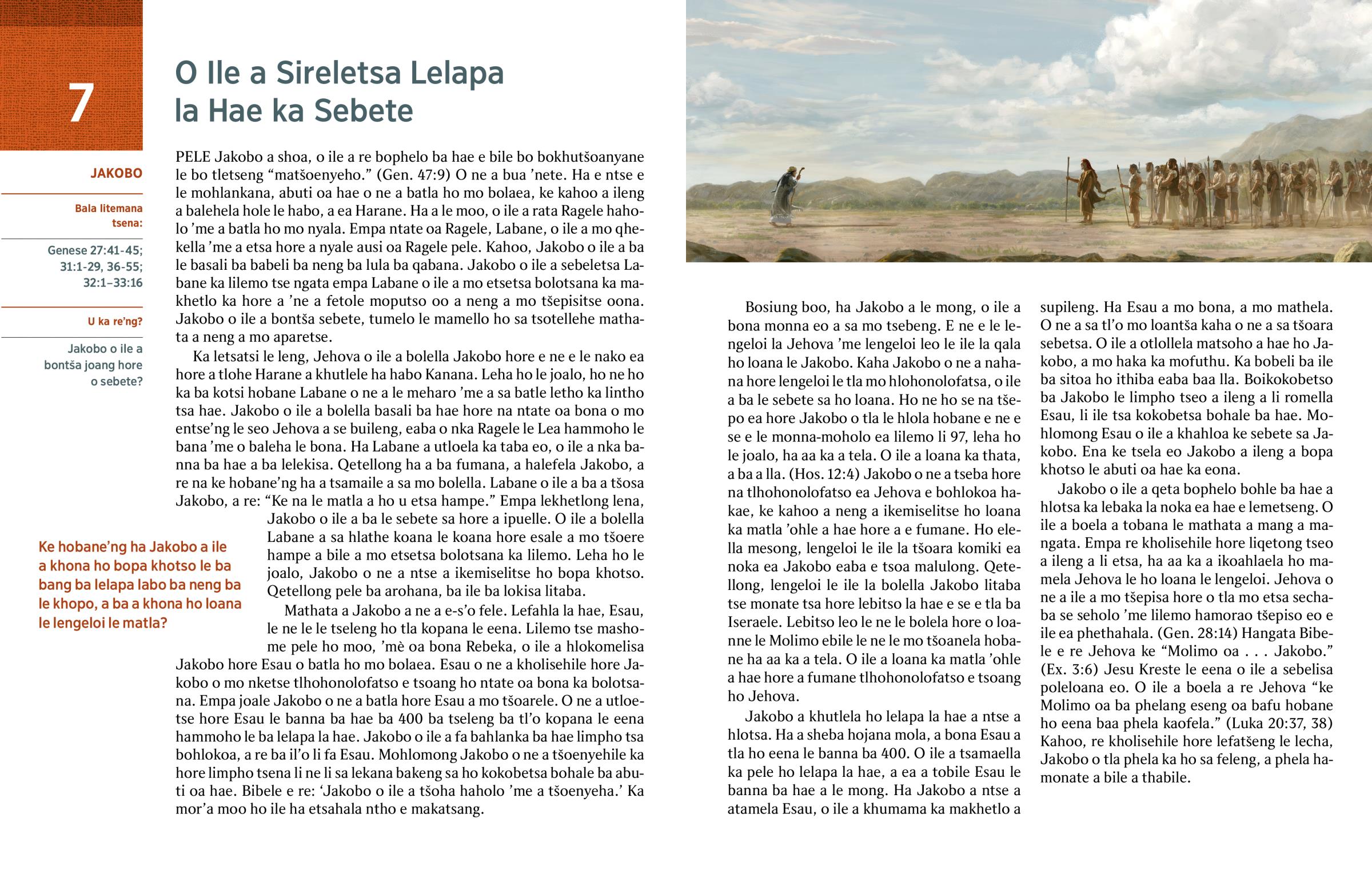 Bosiung boo, ha Jakobo a le mong, o ile a bona monna eo a sa mo tsebeng. E ne e le lengeloi la Jehova ’me lengeloi leo le ile la qala ho loana le Jakobo. Kaha Jakobo o ne a nahana hore lengeloi le tla mo hlohonolofatsa, o ile a ba le sebete sa ho loana. Ho ne ho se na tšepo ea hore Jakobo o tla le hlola hobane e ne e se e le monna-moholo ea lilemo li 97, leha ho le joalo, ha aa ka a tela. O ile a loana ka thata, a ba a lla. (Hos. 12:4) Jakobo o ne a tseba hore na tlhohonolofatso ea Jehova e bohlokoa hakae, ke kahoo a neng a ikemiselitse ho loana ka matla ’ohle a hae hore a e fumane. Ho elella mesong, lengeloi le ile la tšoara komiki ea noka ea Jakobo eaba e tsoa malulong. Qetellong, lengeloi le ile la bolella Jakobo litaba tse monate tsa hore lebitso la hae e se e tla ba Iseraele. Lebitso leo le ne le bolela hore o loanne le Molimo ebile le ne le mo tšoanela hobane ha aa ka a tela. O ile a loana ka matla ’ohle a hae hore a fumane tlhohonolofatso e tsoang ho Jehova.