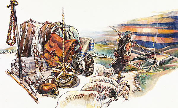 Liaparo tsa molisa li ne li se ngata empa li ne li tšoarella nako e telele. E le hore a itšireletse puleng le moeeng o batang oa bosiu, e ka ’na eaba o ne a apara kobo ea letlalo la nku, le hlanoletsoeng. ’Meleng o ne a apara seaparo sa ka hare. E le hore a se ke a hlajoa ke majoe a motsu le meutloa, o ne a roala meqathatso maotong ʼme o ne a itlama ka lesela le lohiloeng ka boea hloohong.