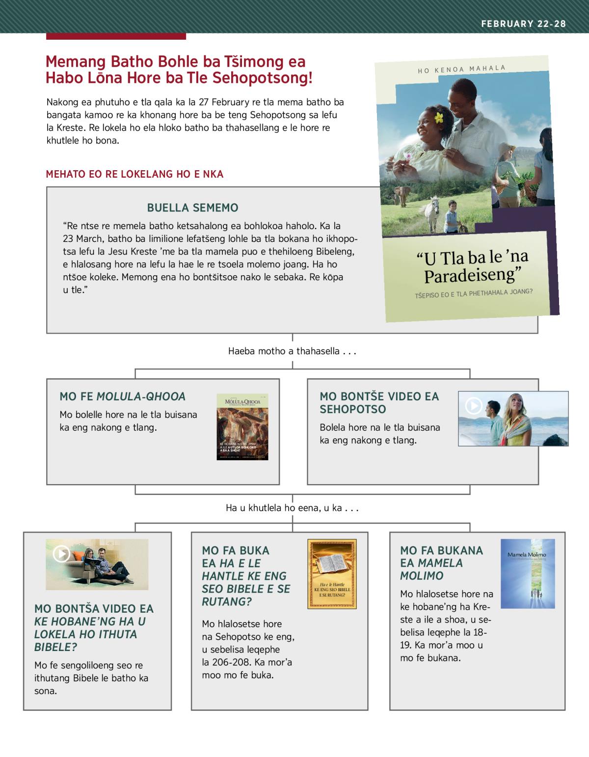 Nakong ea phutuho e tla qala ka la 27 February re tla mema batho ba bangata kamoo re ka khonang hore ba be teng Sehopotsong sa lefu la Kreste. Re lokela ho ela hloko batho ba thahasellang e le hore re khutlele ho bona.