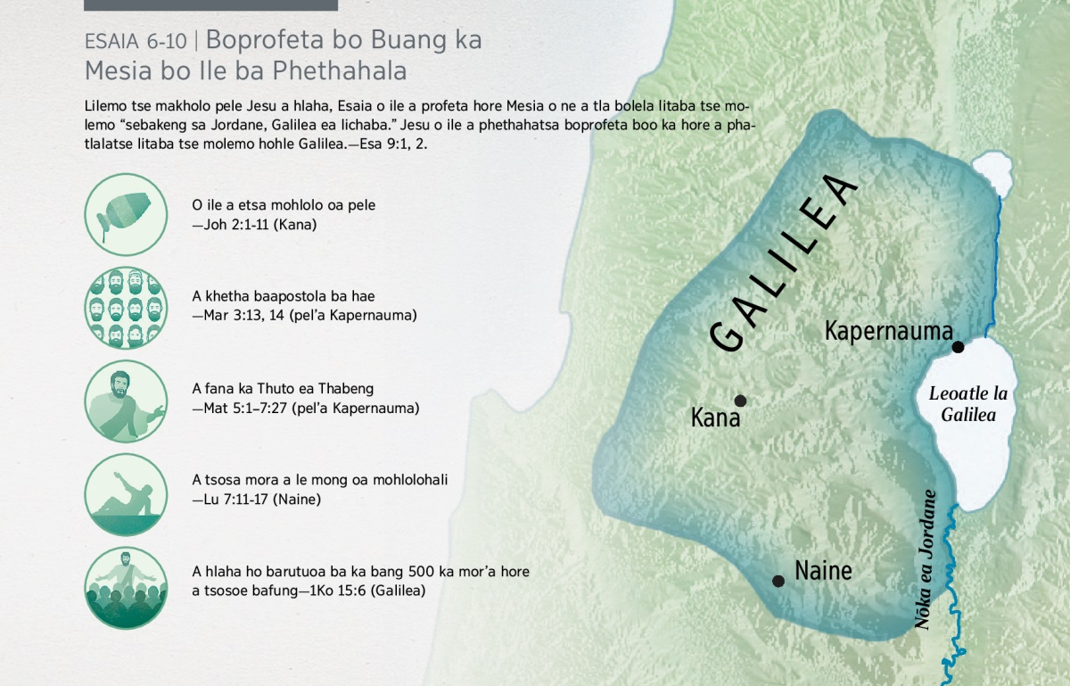 Lilemo tse makholo pele Jesu a hlaha, Esaia o ile a profeta hore Mesia o ne a tla bolela litaba tse molemo “sebakeng sa Jordane, Galilea ea lichaba.” Jesu o ile a phethahatsa boprofeta boo ka hore a phatlalatse litaba tse molemo hohle Galilea.—Esa 9:1, 2.