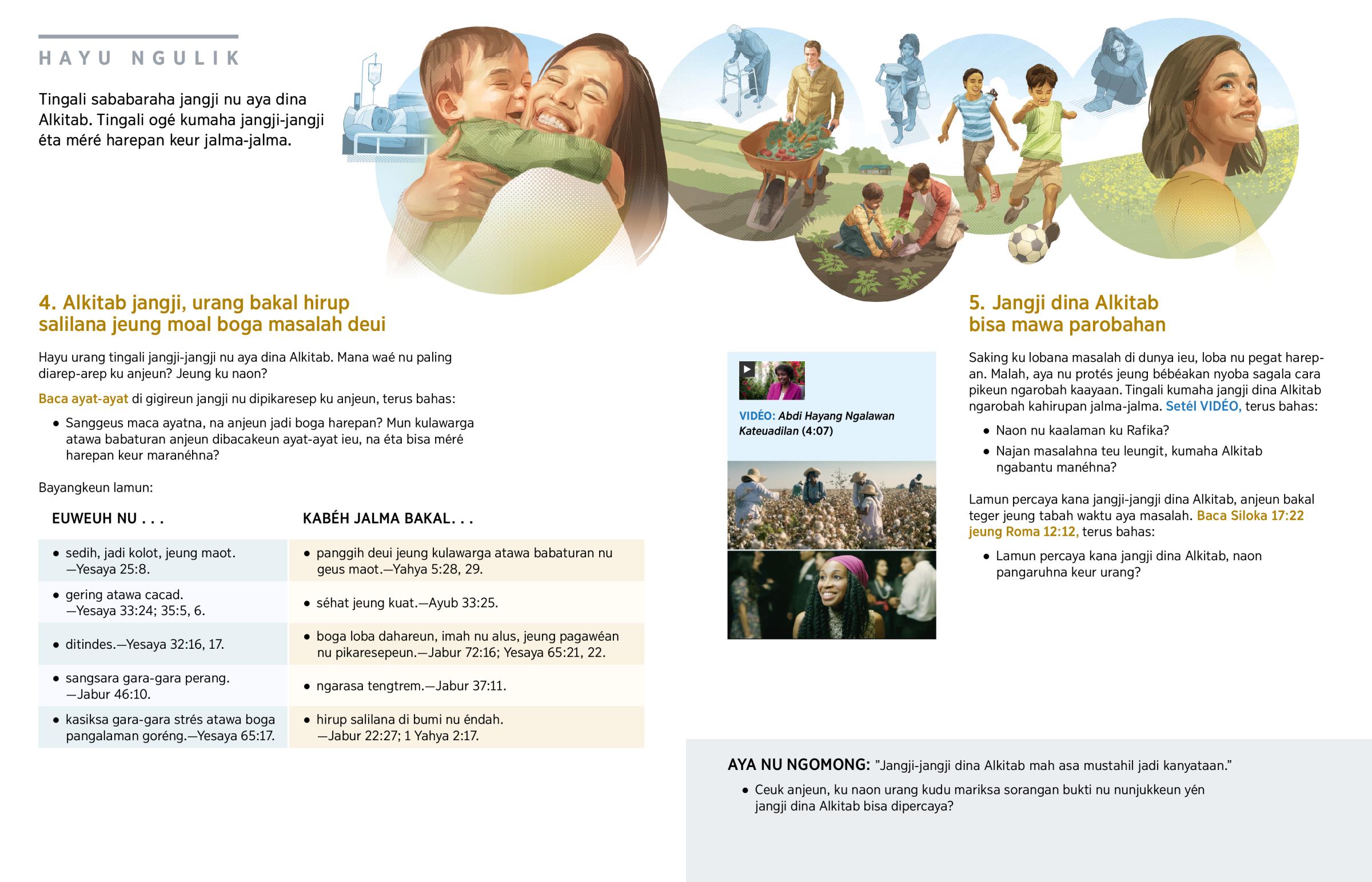 Alkitab ngajelaskeun ku naon ayeuna aya loba masalah. Tapi tong hariwang. Alkitab méré nyaho, hirup téh moal salilana jiga kieu. Masalah-masalah bakal geura leungit. Jangji dina Alkitab téh ”ngahudang harepan” urang. (Baca Jabur 119:49.) Lamun mikirkeun jangji-jangji dina Alkitab, urang bisa tetep teger jeung boga pikiran nu positif najan aya masalah. Urang gé bisa bagja salilana.