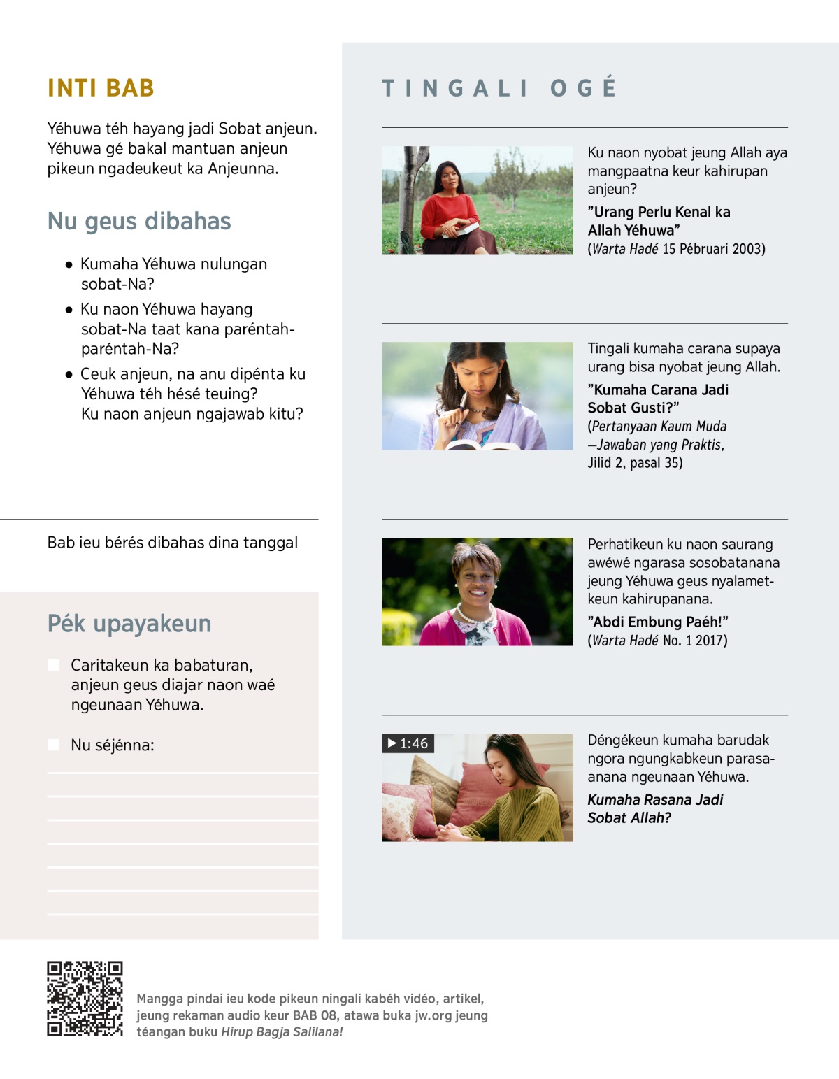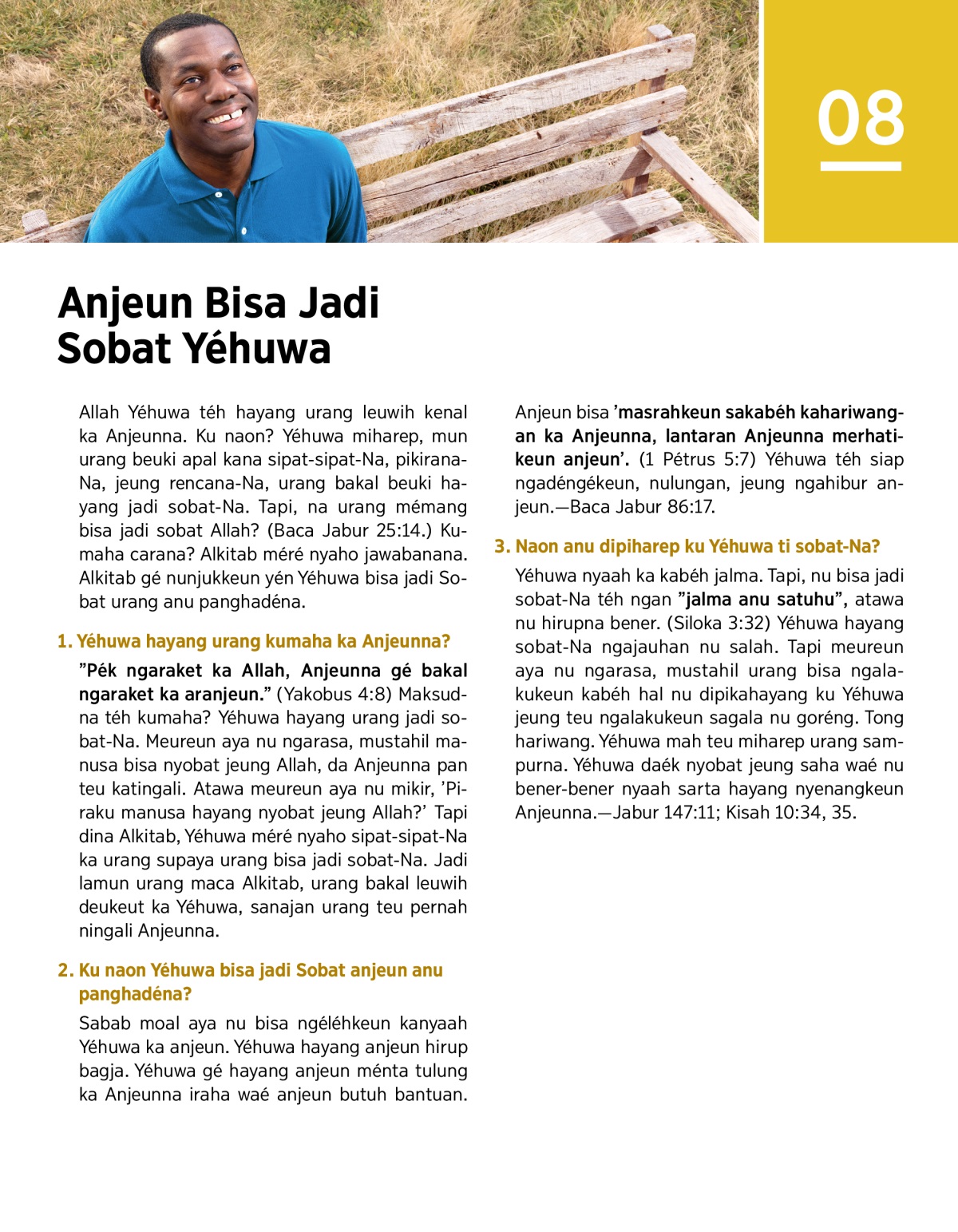 Allah Yéhuwa téh hayang urang leuwih kenal ka Anjeunna. Ku naon? Yéhuwa miharep, mun urang beuki apal kana sipat-sipat-Na, pikirana-Na, jeung rencana-Na, urang bakal beuki hayang jadi sobat-Na. Tapi, na urang mémang bisa jadi sobat Allah? (Baca Jabur 25:14.) Kumaha carana? Alkitab méré nyaho jawabanana. Alkitab gé nunjukkeun yén Yéhuwa bisa jadi Sobat urang anu panghadéna.