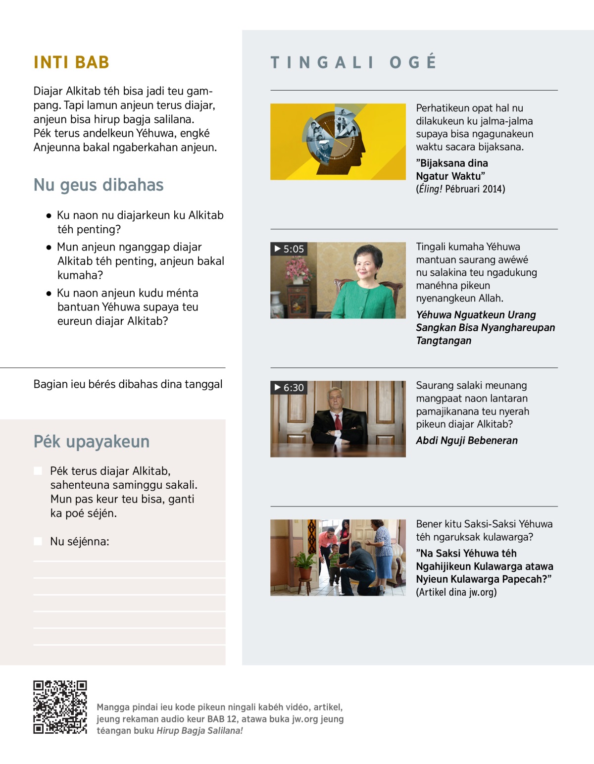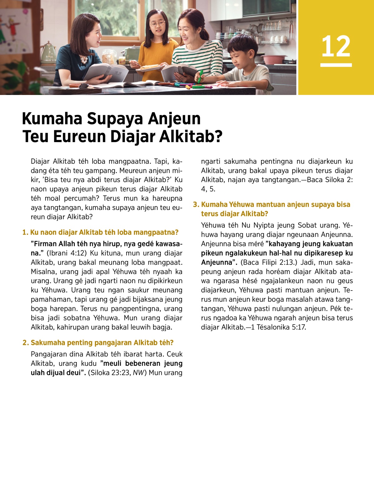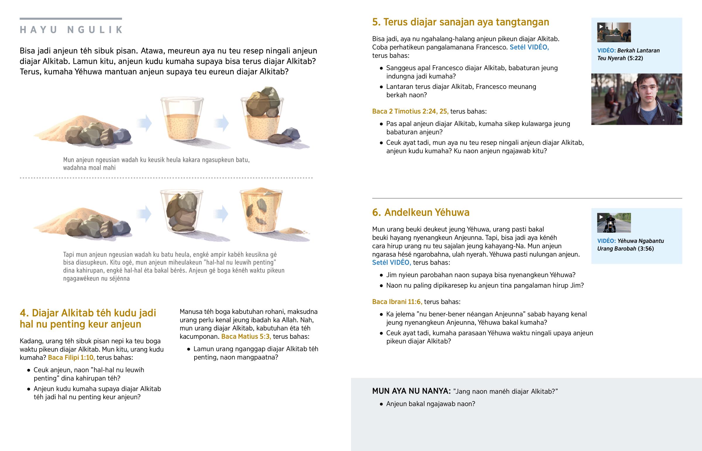 Diajar Alkitab téh loba mangpaatna. Tapi, kadang éta téh teu gampang. Meureun anjeun mikir, ’Bisa teu nya abdi terus diajar Alkitab?’ Ku naon upaya anjeun pikeun terus diajar Alkitab téh moal percumah? Terus mun ka hareupna aya tangtangan, kumaha supaya anjeun teu eureun diajar Alkitab?
