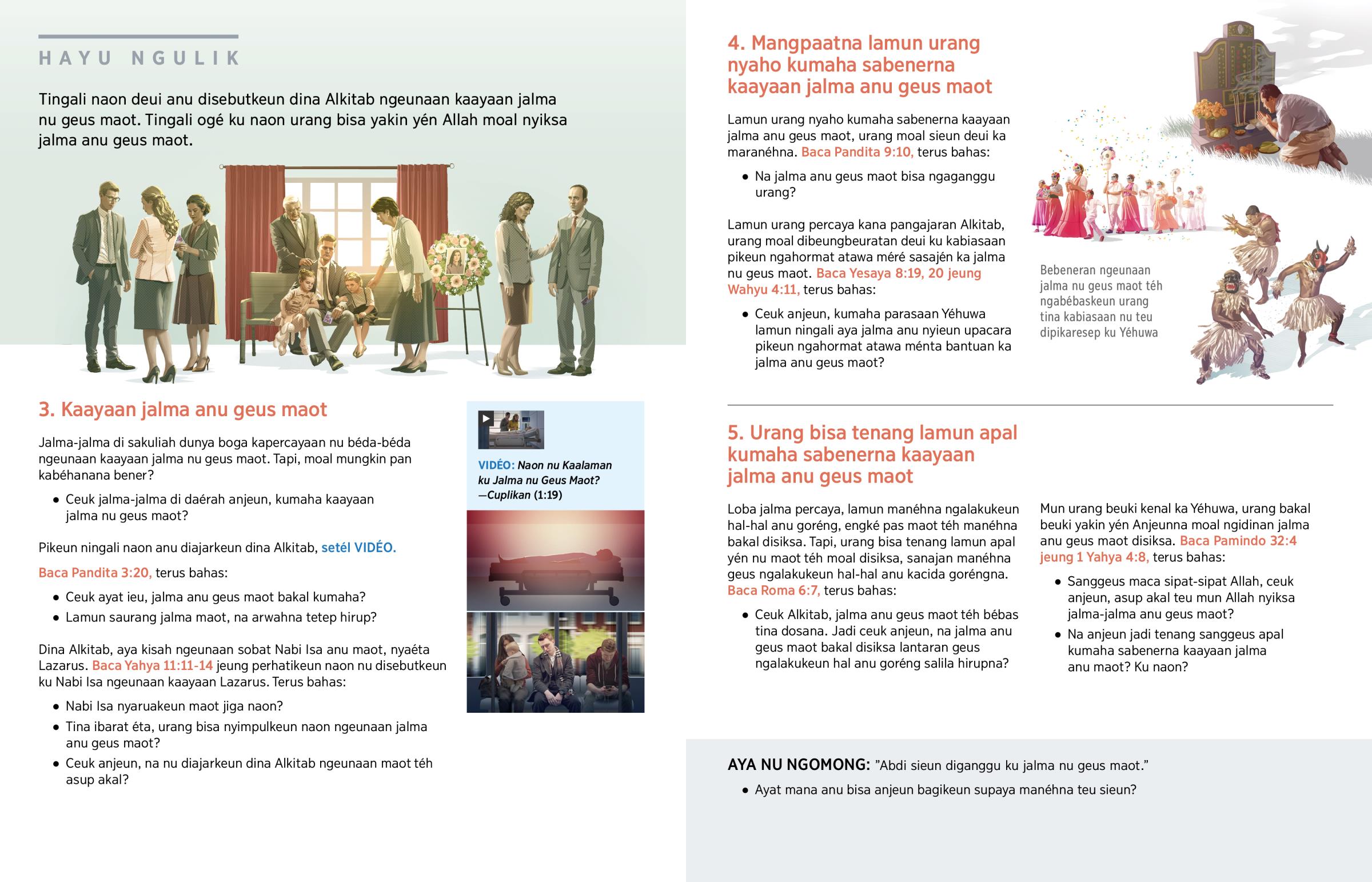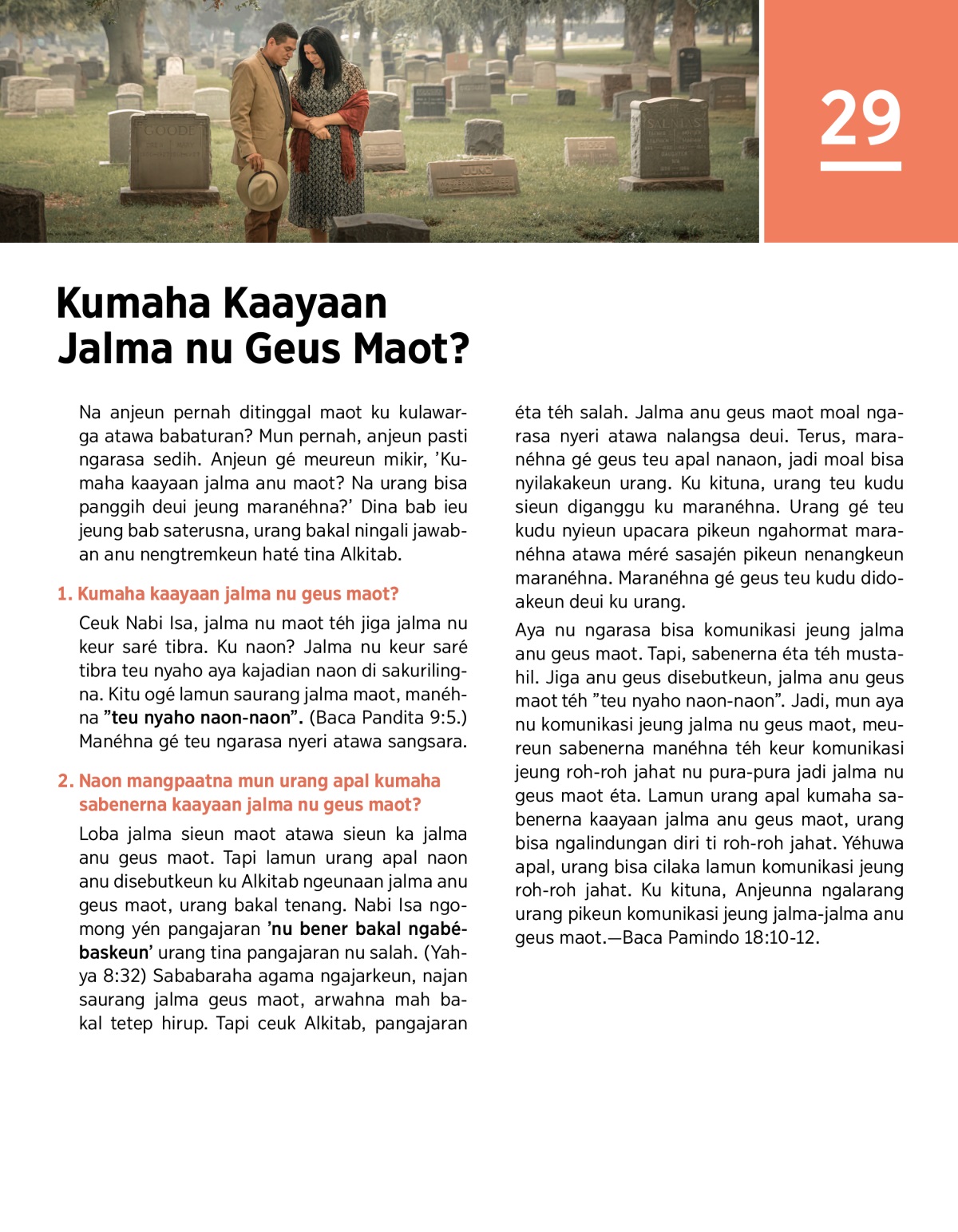 Na anjeun pernah ditinggal maot ku kulawarga atawa babaturan? Mun pernah, anjeun pasti ngarasa sedih. Anjeun gé meureun mikir, ’Kumaha kaayaan jalma anu maot? Na urang bisa panggih deui jeung maranéhna?’ Dina bab ieu jeung bab saterusna, urang bakal ningali jawaban anu nengtremkeun haté tina Alkitab.