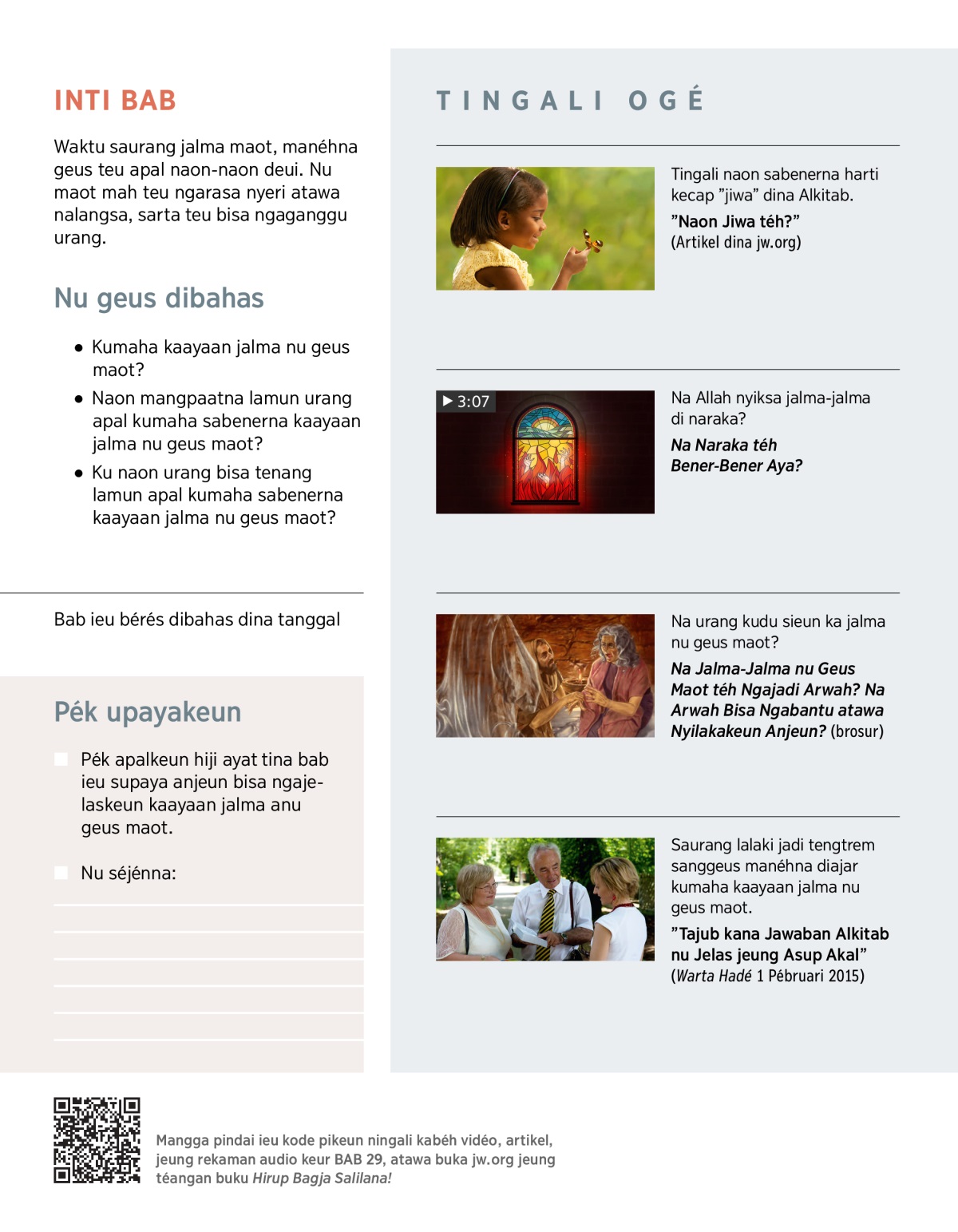 Lamun urang nyaho kumaha sabenerna kaayaan jalma anu geus maot, urang moal sieun deui ka maranéhna. Baca Pandita 9:10, terus bahas: