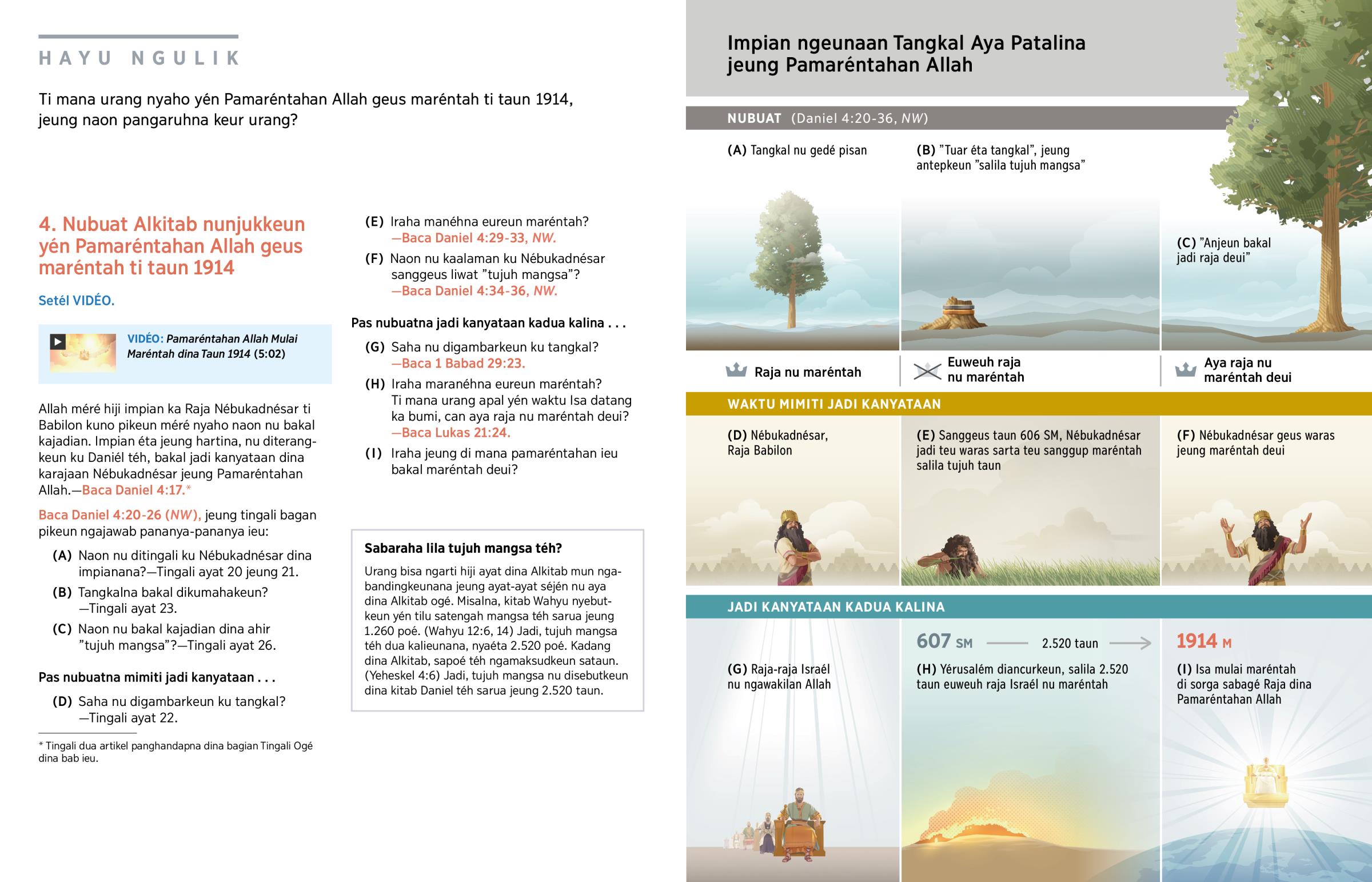 Kitab Daniel nunjukkeun yén Pamaréntahan Allah bakal mulai maréntah lamun ”tujuh mangsa” enggeusan. (Daniel 4:16, 17, NW) Sababaraha abad sanggeusna, Isa nyebut mangsa éta téh sabagé ”waktu nu ditetepkeun keur bangsa-bangsa”. Manéhna gé nunjukkeun yén waktu manéhna di bumi kénéh, éta mangsa téh can béak. (Lukas 21:24) Engké urang bakal ngabahas, tujuh mangsa éta bakal enggeusan dina taun 1914.