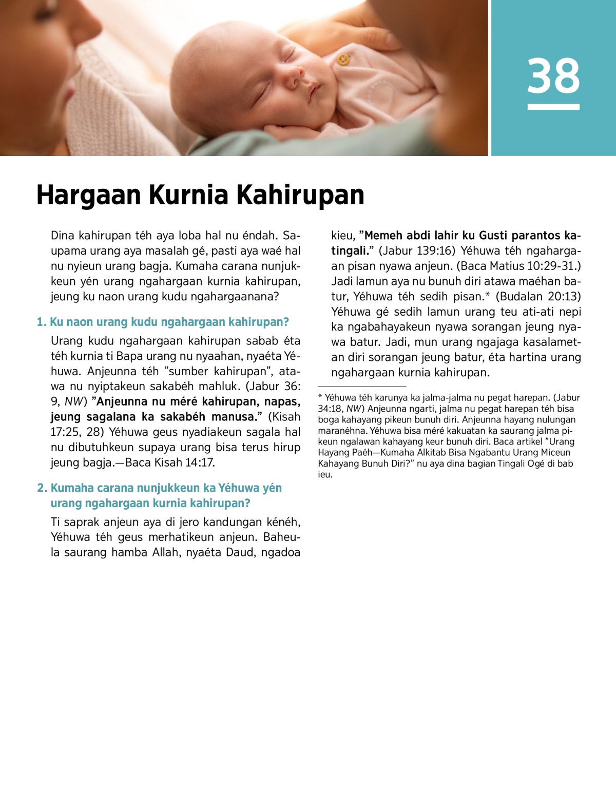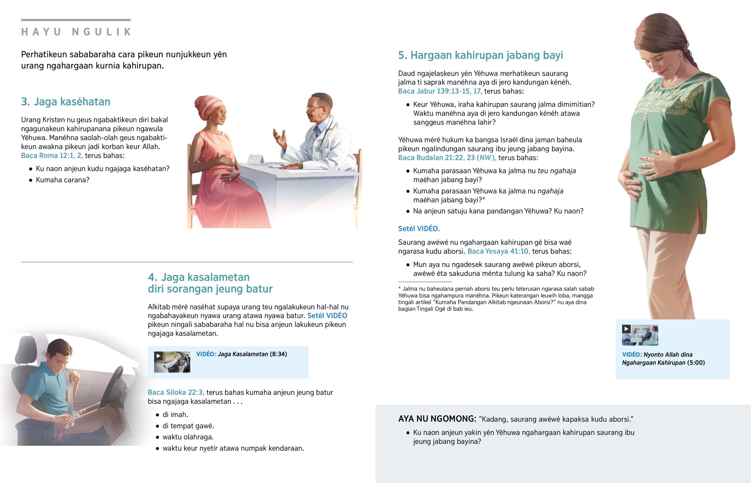 Ti saprak anjeun aya di jero kandungan kénéh, Yéhuwa téh geus merhatikeun anjeun. Baheula saurang hamba Allah, nyaéta Daud, ngadoa kieu, ”Memeh abdi lahir ku Gusti parantos katingali.” (Jabur 139:16) Yéhuwa téh ngahargaan pisan nyawa anjeun. (Baca Matius 10:29-31.) Jadi lamun aya nu bunuh diri atawa maéhan batur, Yéhuwa téh sedih pisan.a (Budalan 20:13) Yéhuwa gé sedih lamun urang teu ati-ati nepi ka ngabahayakeun nyawa sorangan jeung nyawa batur. Jadi, mun urang ngajaga kasalametan diri sorangan jeung batur, éta hartina urang ngahargaan kurnia kahirupan.