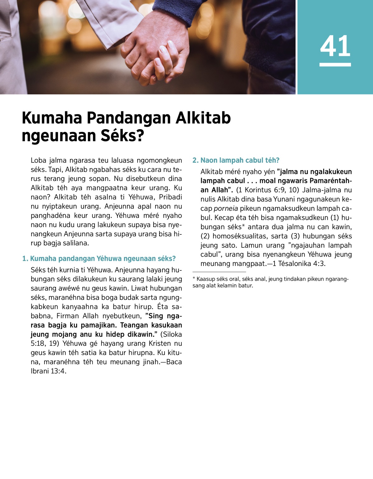 Yéhuwa hayang urang kabéh nyingkahan lampah cabul. Baca 1 Korintus 6:18, terus bahas: