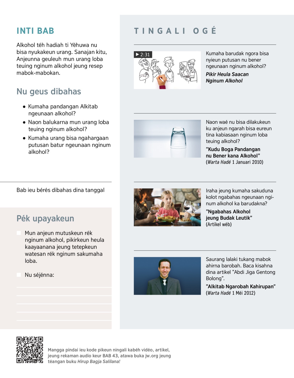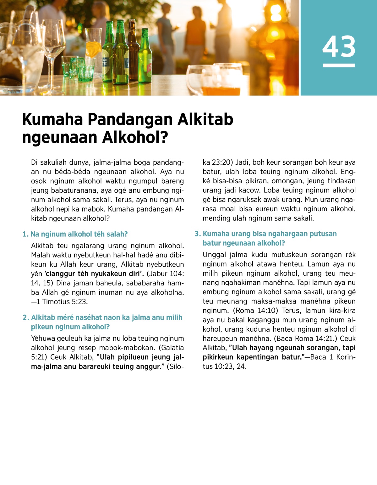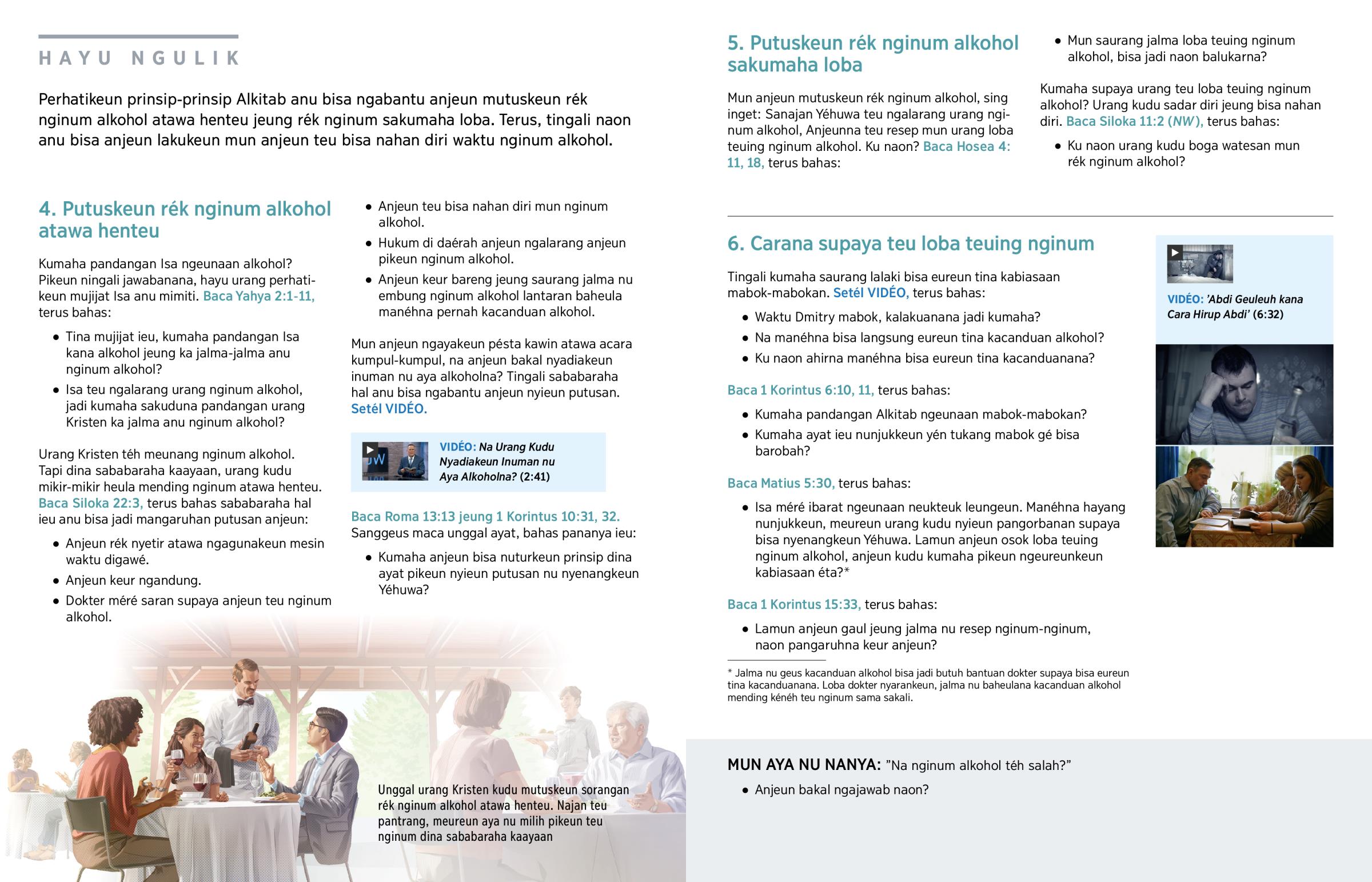 Yéhuwa geuleuh ka jalma nu loba teuing nginum alkohol jeung resep mabok-mabokan. (Galatia 5:21) Ceuk Alkitab, ”Ulah pipilueun jeung jalma-jalma anu barareuki teuing anggur.” (Siloka 23:20) Jadi, boh keur sorangan boh keur aya batur, ulah loba teuing nginum alkohol. Engké bisa-bisa pikiran, omongan, jeung tindakan urang jadi kacow. Loba teuing nginum alkohol gé bisa ngaruksak awak urang. Mun urang ngarasa moal bisa eureun waktu nginum alkohol, mending ulah nginum sama sakali.