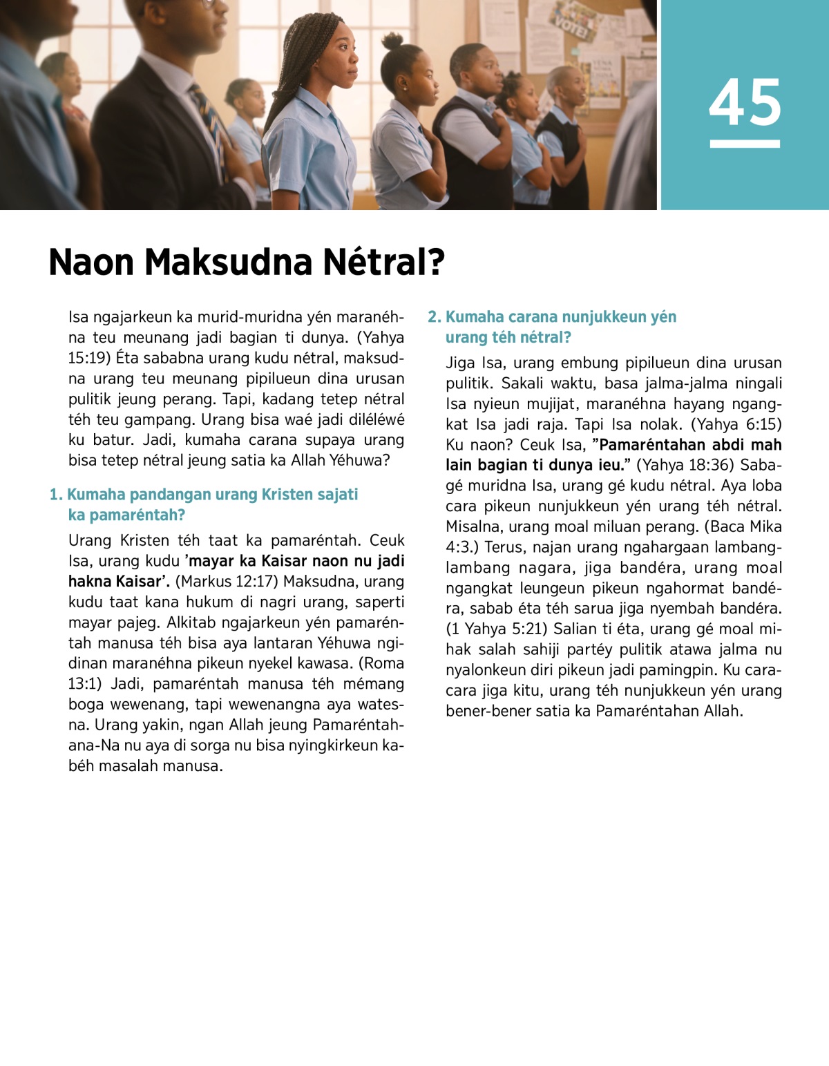 Jiga Isa, urang embung pipilueun dina urusan pulitik. Sakali waktu, basa jalma-jalma ningali Isa nyieun mujijat, maranéhna hayang ngang-kat Isa jadi raja. Tapi Isa nolak. (Yahya 6:15) Ku naon? Ceuk Isa, ”Pamaréntahan abdi mah lain bagian ti dunya ieu.” (Yahya 18:36) Sabagé muridna Isa, urang gé kudu nétral. Aya loba cara pikeun nunjukkeun yén urang téh nétral. Misalna, urang moal miluan perang. (Baca Mika 4:3.) Terus, najan urang ngahargaan lambang-lambang nagara, jiga bandéra, urang moal ngangkat leungeun pikeun ngahormat bandéra, sabab éta téh sarua jiga nyembah bandéra. (1 Yahya 5:21) Salian ti éta, urang gé moal mihak salah sahiji partéy pulitik atawa jalma nu nyalonkeun diri pikeun jadi pamingpin. Ku cara-cara jiga kitu, urang téh nunjukkeun yén urang bener-bener satia ka Pamaréntahan Allah.