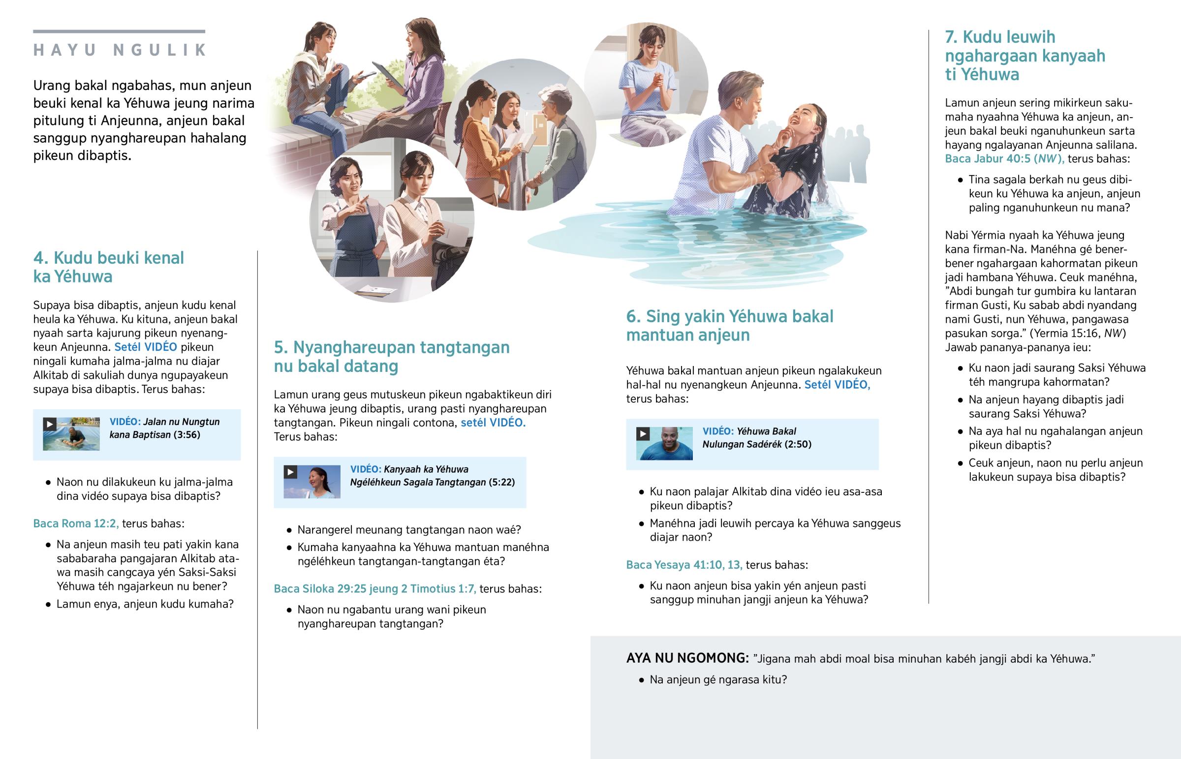 Supaya bisa dibaptis, anjeun kudu kenal heula ka Yéhuwa. Ku kituna, anjeun bakal nyaah sarta kajurung pikeun nyenangkeun Anjeunna. Setél VIDÉO pikeun ningali kumaha jalma-jalma nu diajar Alkitab di sakuliah dunya ngupayakeun supaya bisa dibaptis. Terus bahas: