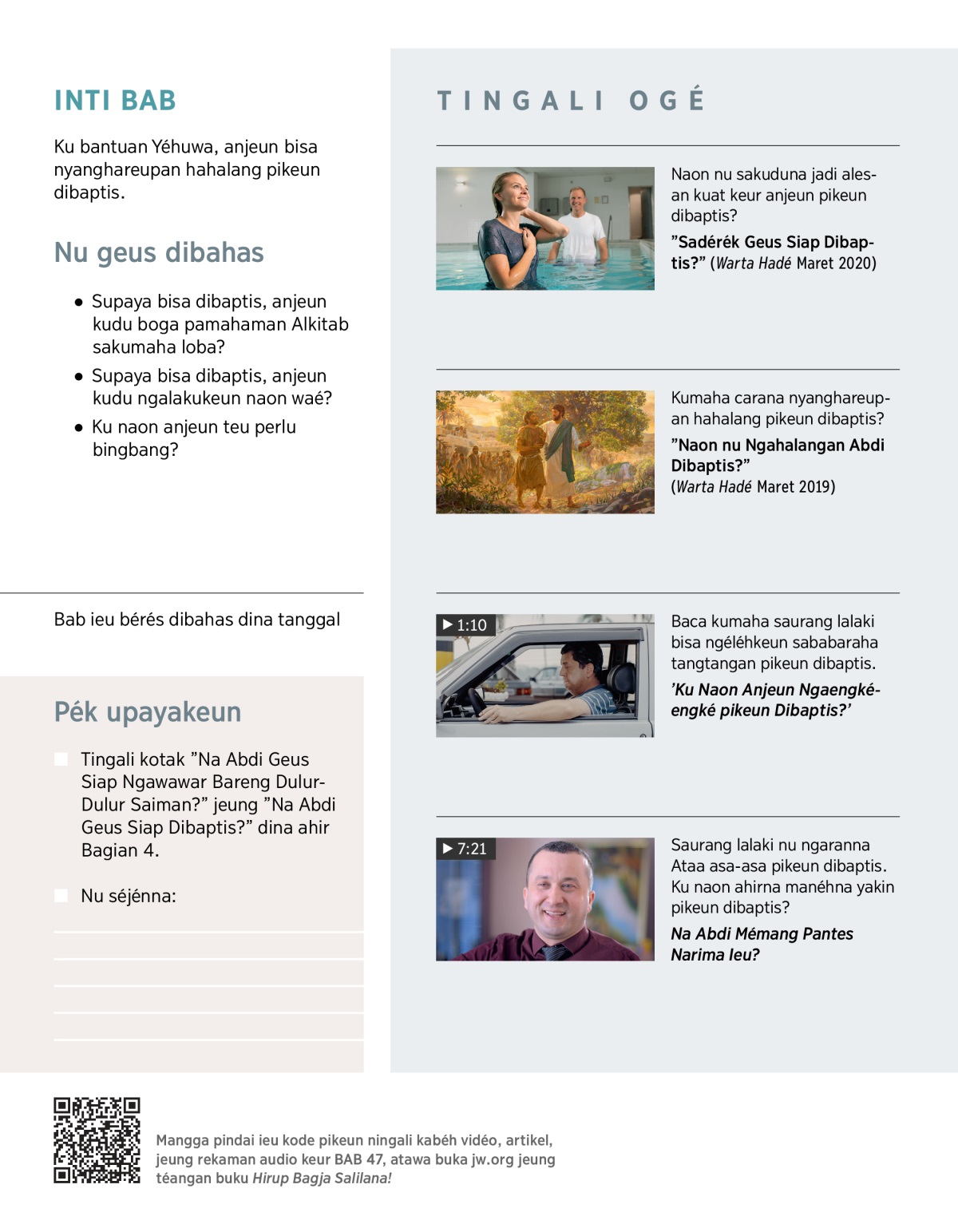 Salila ieu, anjeun geus diajar loba hal ngeunaan Yéhuwa. Meureun anjeun geus nyieun sababaraha parobahan supaya bisa ngajalankeun naon nu geus diajarkeun. Tapi, bisa waé anjeun masih ngarasa can siap pikeun ngabaktikeun diri ka Yéhuwa jeung dibaptis. Dina bab ieu, urang bakal ngabahas sababaraha hal nu biasana ngahalangan saurang jalma pikeun dibaptis jeung kumaha anjeun bisa nyanghareupanana.