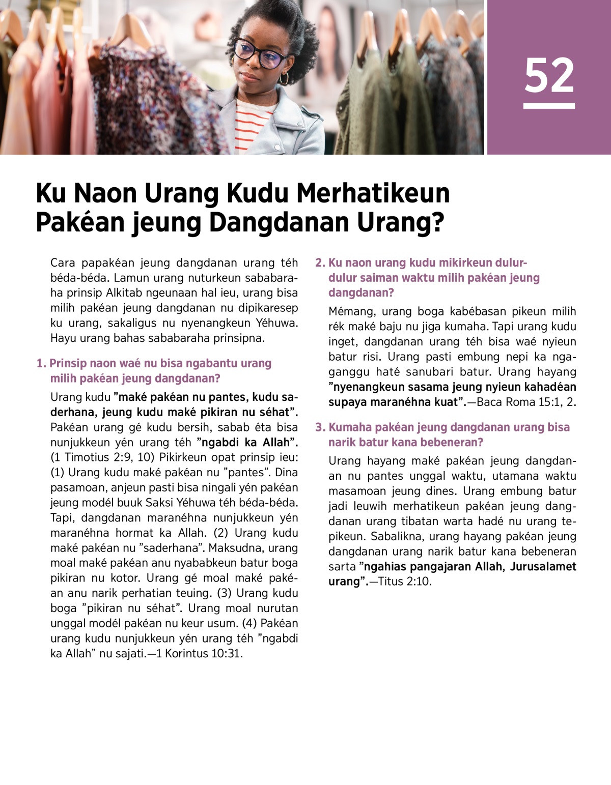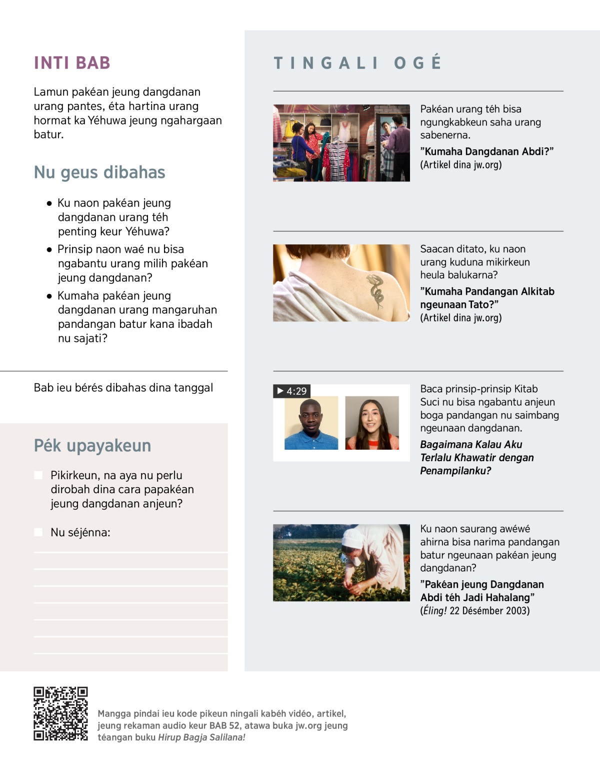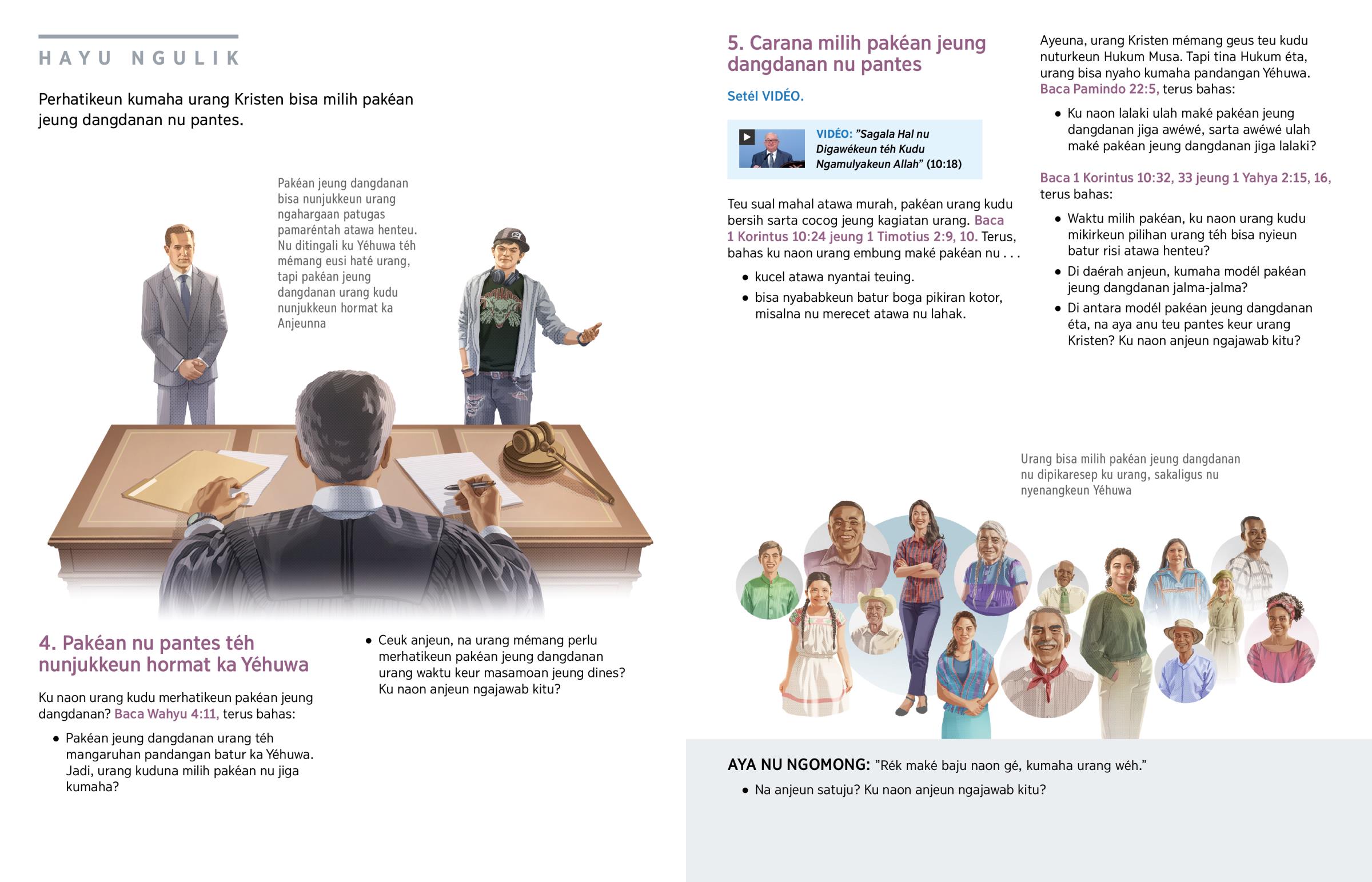 Teu sual mahal atawa murah, pakéan urang kudu bersih sarta cocog jeung kagiatan urang. Baca 1 Korintus 10:24 jeung 1 Timotius 2:9, 10. Terus, bahas ku naon urang embung maké pakéan nu . . .