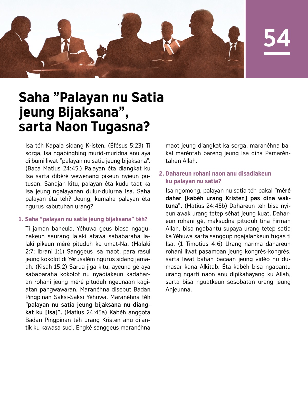 Ti jaman baheula, Yéhuwa geus biasa ngagunakeun saurang lalaki atawa sababaraha lalaki pikeun méré pituduh ka umat-Na. (Malaki 2:7; Ibrani 1:1) Sanggeus Isa maot, para rasul jeung kokolot di Yérusalém ngurus sidang jamaah. (Kisah 15:2) Sarua jiga kitu, ayeuna gé aya sababaraha kokolot nu nyadiakeun kadaharan rohani jeung méré pituduh ngeunaan kagiatan pangwawaran. Maranéhna disebut Badan Pingpinan Saksi-Saksi Yéhuwa. Maranéhna téh ”palayan nu satia jeung bijaksana nu diangkat ku [Isa]”. (Matius 24:45a) Kabéh anggota Badan Pingpinan téh urang Kristen anu dilantik ku kawasa suci. Engké sanggeus maranéhna maot jeung diangkat ka sorga, maranéhna bakal maréntah bareng jeung Isa dina Pamaréntahan Allah.