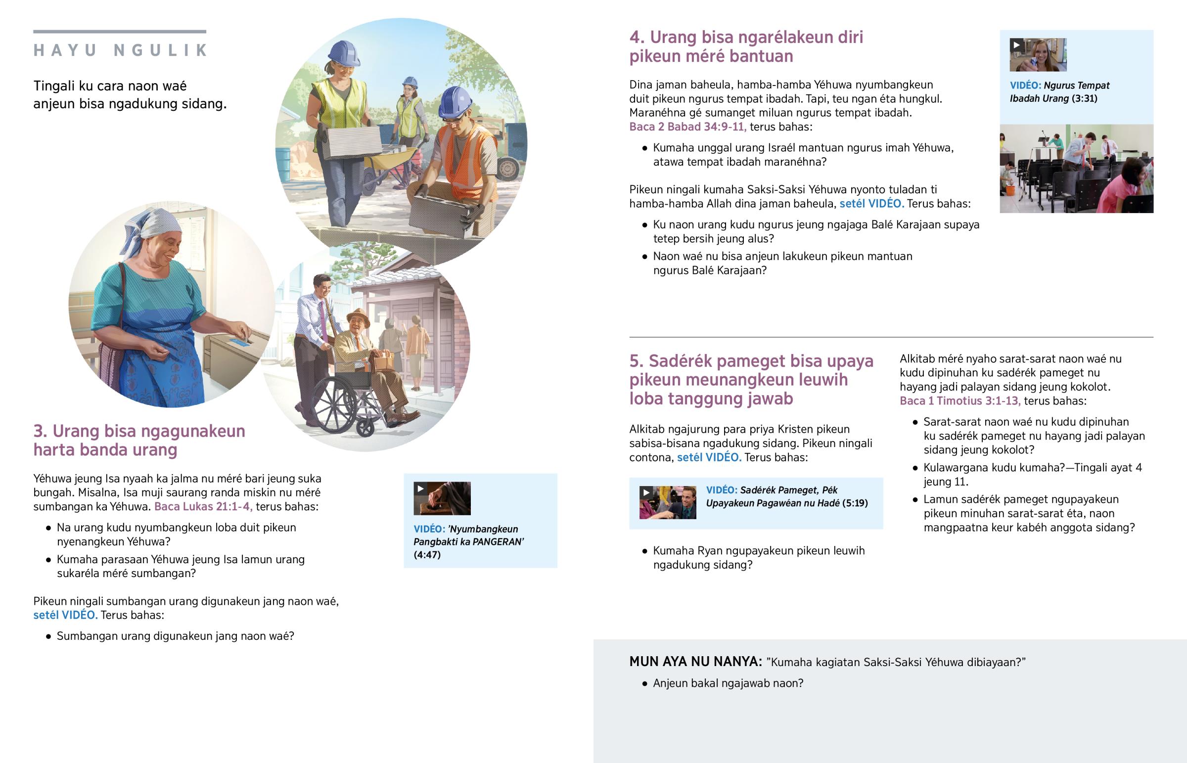 Urang kabéh bisa méré bantuan ka sidang. Misalna, na di sidang anjeun aya nu geus sepuh atawa lemah fisik? Mun rék masamoan, meureun anjeun bisa nyampeur jeung nganteur manéhna. Atawa, anjeun meureun bisa mantuan balanja jeung bébérés imahna. (Baca Yakobus 1:27.) Terus, urang gé bisa milu ngabersihan jeung ngarawat Balé Karajaan urang. Teu aya nu maksa urang pikeun ngalakukeun hal-hal ieu. Urang sukaréla ngalakukeunana lantaran nyaah ka Allah jeung ka dulur-dulur saiman.—Jabur 110:3.
