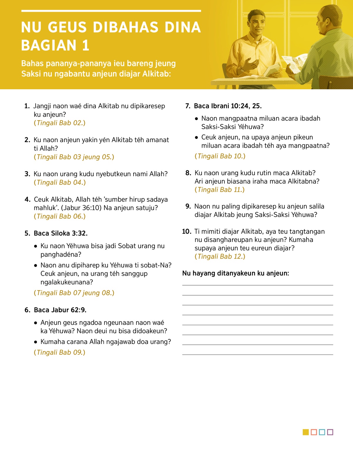 Bahas pananya-pananya ieu bareng jeung Saksi nu ngabantu anjeun diajar Alkitab: