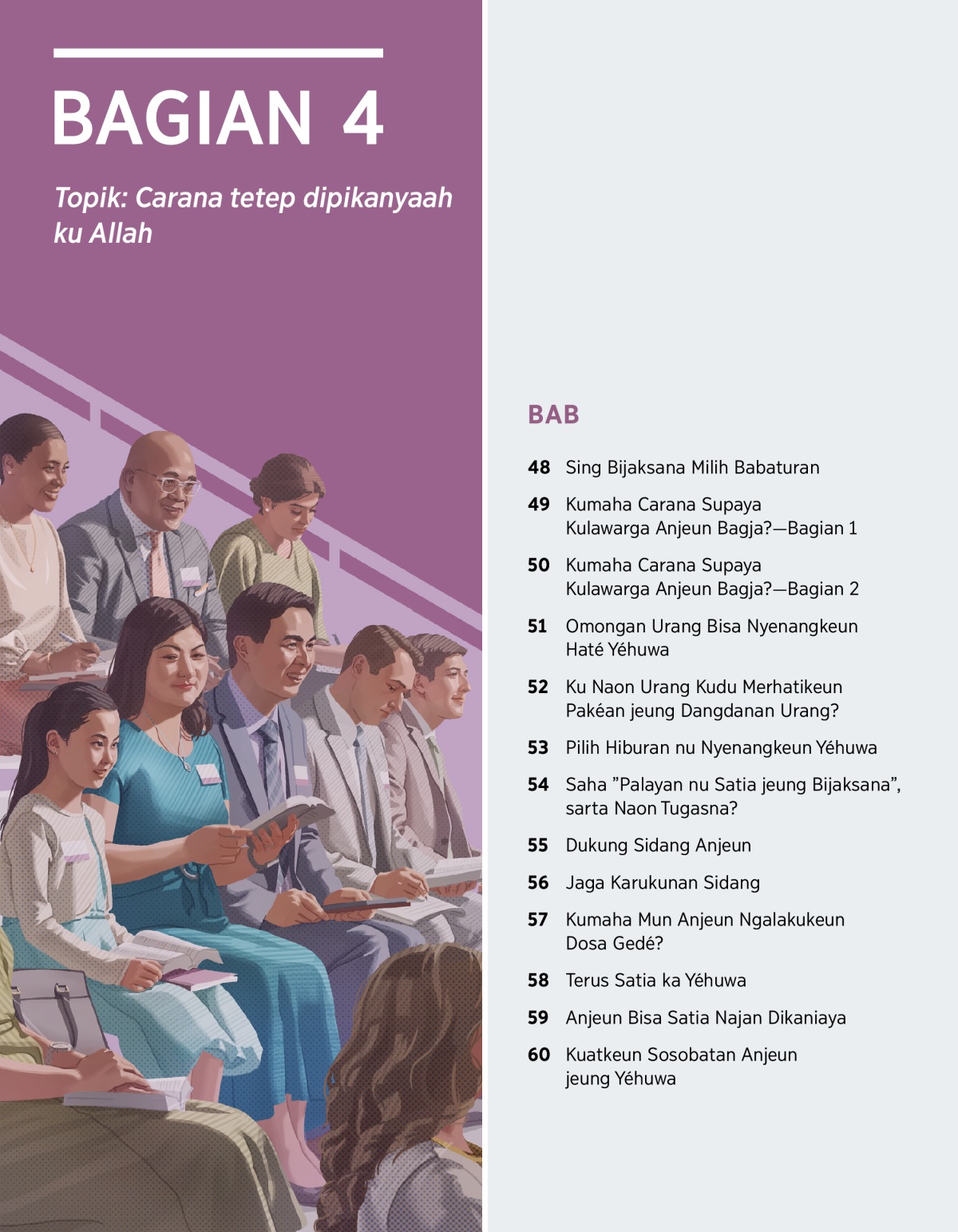 Bagian 4 Édisi nu Dicitak Topik: Carana tetep dipikanyaah ku Allah BAB 48 Sing Bijaksana Milih Babaturan 49 Kumaha Carana Supaya Kulawarga Anjeun Bagja?—Bagian 1 50 Kumaha Carana Supaya Kulawarga Anjeun Bagja?—Bagian 2 51 Omongan Urang Bisa Nyenangkeun Haté Yéhuwa 52 Ku Naon Urang Kudu Merhatikeun Pakéan jeung Dangdanan Urang? 53 Pilih Hiburan nu Nyenangkeun Yéhuwa 54 Saha ”Palayan nu Satia jeung Bijaksana”, sarta Naon Tugasna? 55 Dukung Sidang Anjeun 56 Jaga Karukunan Sidang 57 Kumaha Mun Anjeun Ngalakukeun Dosa Gedé? 58 Terus Satia ka Yéhuwa 59 Anjeun Bisa Satia Najan Dikaniaya 60 Kuatkeun Sosobatan Anjeun jeung Yéhuwa