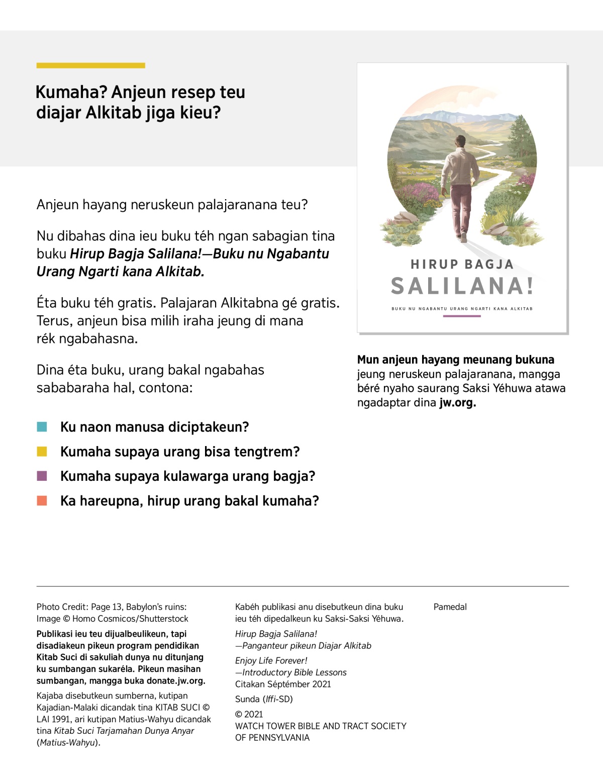 Mun anjeun hayang meunang bukuna jeung neruskeun palajaranana, mangga béré nyaho saurang Saksi Yéhuwa atawa ngadaptar dina jw.org.