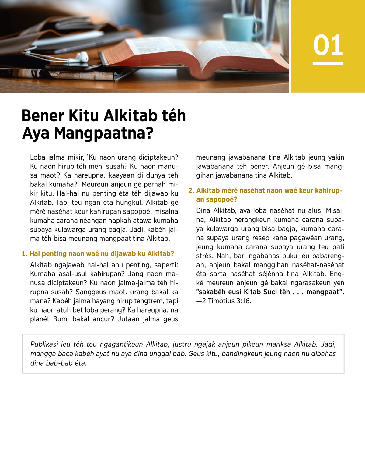 Loba jalma mikir, ’Ku naon urang diciptakeun? Ku naon hirup téh meni susah? Ku naon manusa maot? Ka hareupna, kaayaan di dunya téh bakal kumaha?’ Meureun anjeun gé pernah mikir kitu. Hal-hal nu penting éta téh dijawab ku Alkitab. Tapi teu ngan éta hungkul. Alkitab gé méré naséhat keur kahirupan sapopoé, misalna kumaha carana néangan napkah atawa kumaha supaya kulawarga urang bagja. Jadi, kabéh jalma téh bisa meunang mangpaat tina Alkitab.
