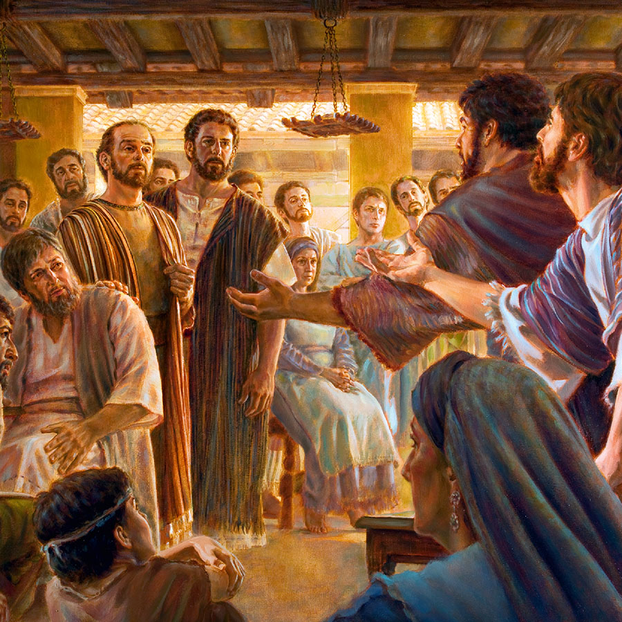 Prima e última pàgina Paulo, Tabita, Gálio, Lucas, um oficial do templo com os apóstolos, um saduceu, Paulo sendo escoltado até Cesareia e testemunho sendo dado nos tempos atuais, com carro de som e fonógrafo.