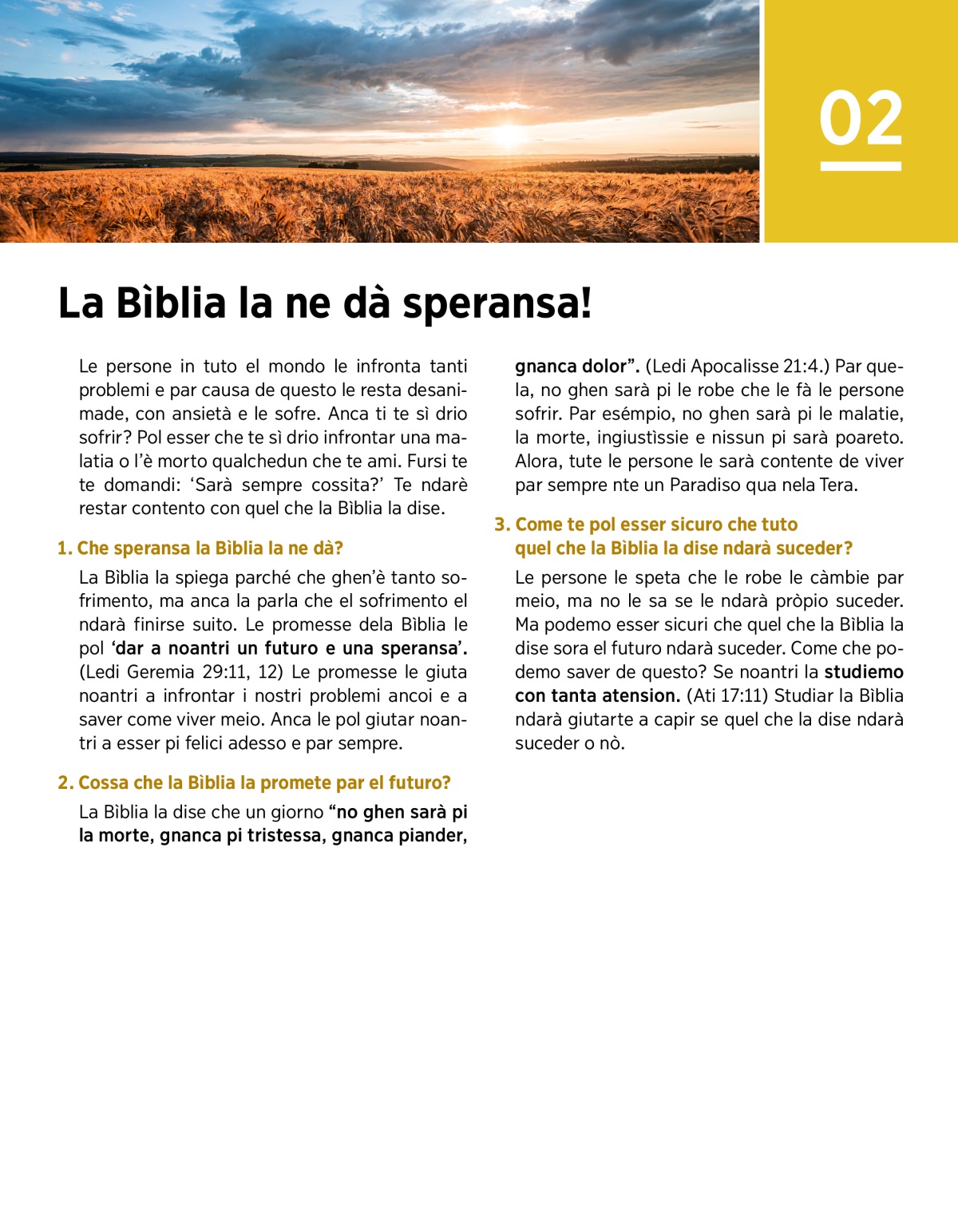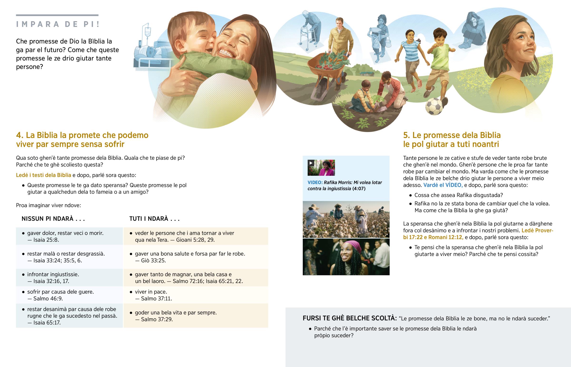 • Te pensi che la speransa che ghen’è nela Bìblia la pol giutarte a viver meio? Parché che te pensi cossita?