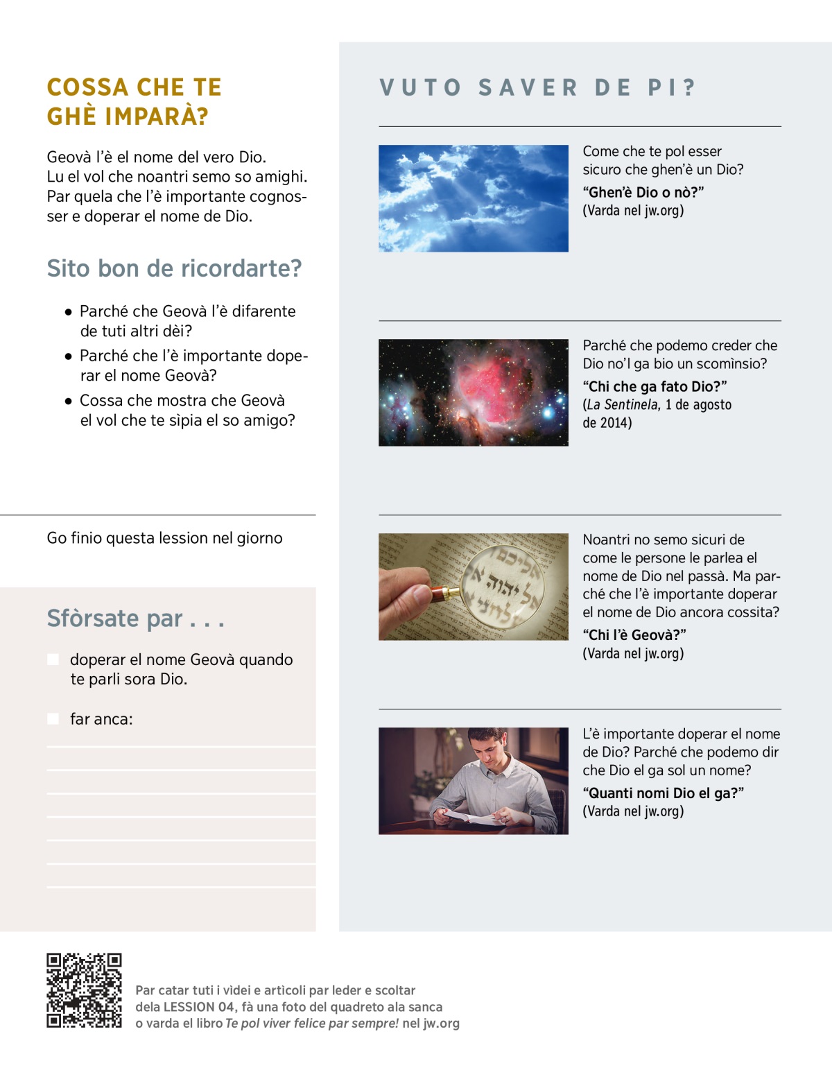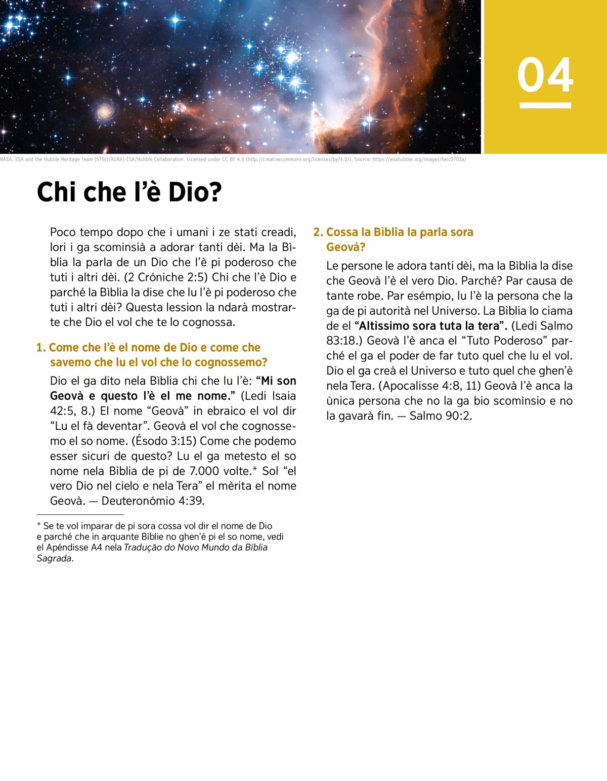 Poco tempo dopo che i umani i ze stati creadi, lori i ga scominsià a adorar tanti dèi. Ma la Bìblia la parla de un Dio che l’è pi poderoso che tuti i altri dèi. (2 Cróniche 2:5) Chi che l’è Dio e parché la Bìblia la dise che lu l’è pi poderoso che tuti i altri dèi? Questa lession la ndarà mostrarte che Dio el vol che te lo cognossa.