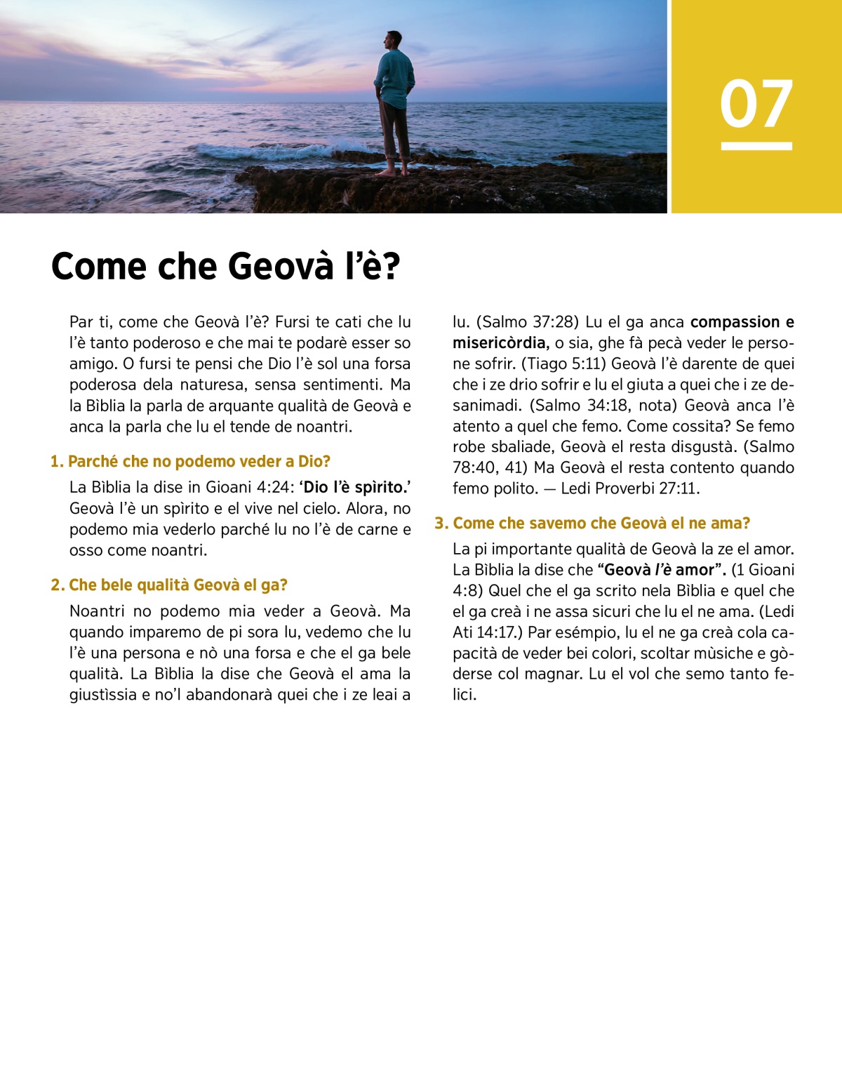 Par ti, come che Geovà l’è? Fursi te cati che lu l’è tanto poderoso e che mai te podarè esser so amigo. O fursi te pensi che Dio l’è sol una forsa poderosa dela naturesa, sensa sentimenti. Ma la Bìblia la parla de arquante qualità de Geovà e anca la parla che lu el tende de noantri.