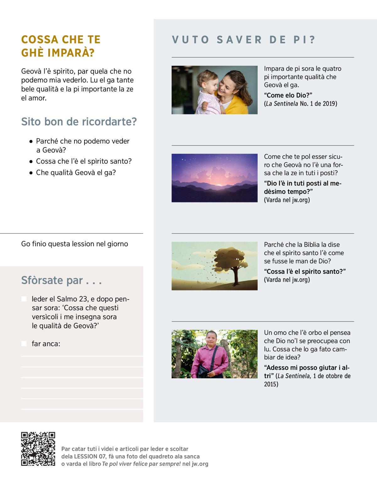Te pensi che Geovà el vol pròpio giutar le persone? Pénsito che el ga poder par far questo? Parché che te pensi cossita?