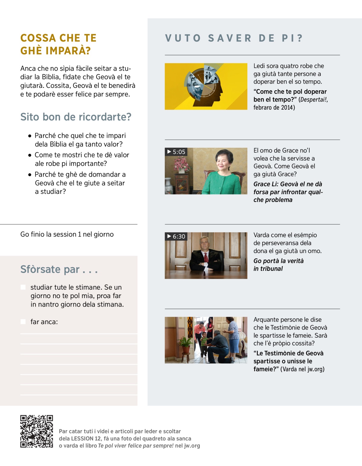 Quando cognossemo de pi a Geovà, volemo assarlo contento. Ma pol esser fadiga far quel che lu el ne domanda. Se questo l’è drio suceder con ti, no stà mia desister parché Geovà el te giutarà. Vardé el VÌDEO, e dopo, parlé sora questo.