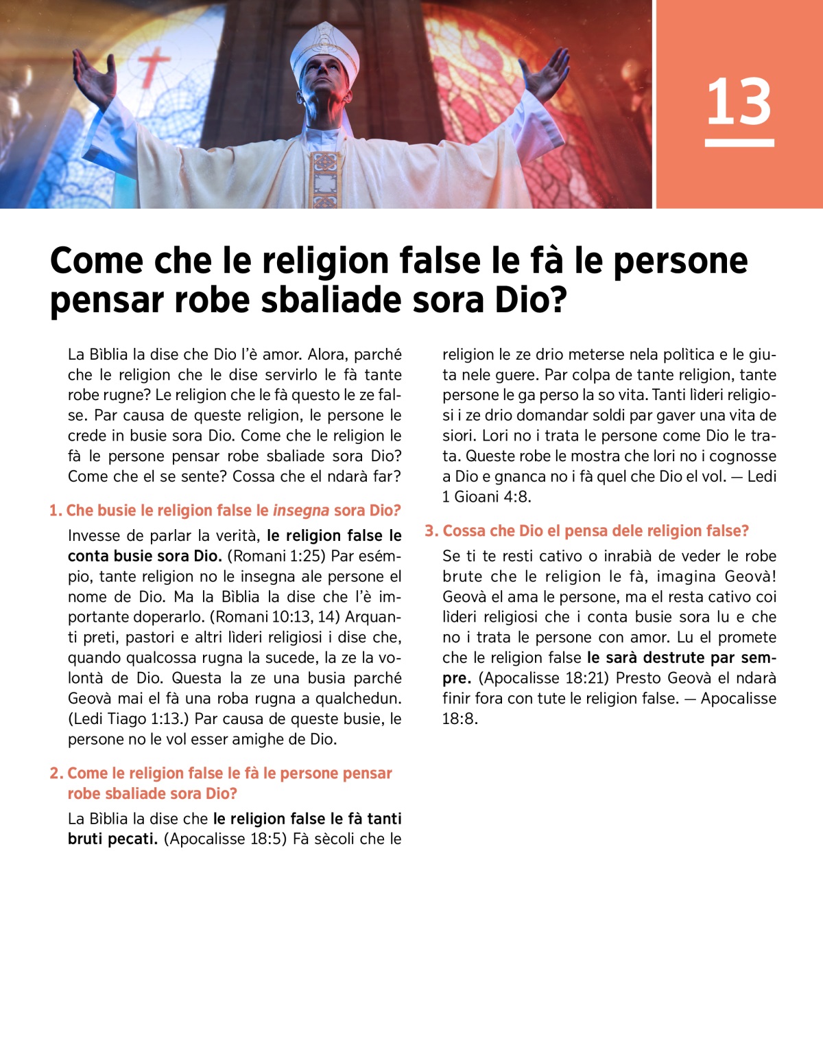 La Bìblia la dise che Dio l’è amor. Alora, parché che le religion che le dise servirlo le fà tante robe rugne? Le religion che le fà questo le ze false. Par causa de queste religion, le persone le crede in busie sora Dio. Come che le religion le fà le persone pensar robe sbaliade sora Dio? Come che el se sente? Cossa che el ndarà far?